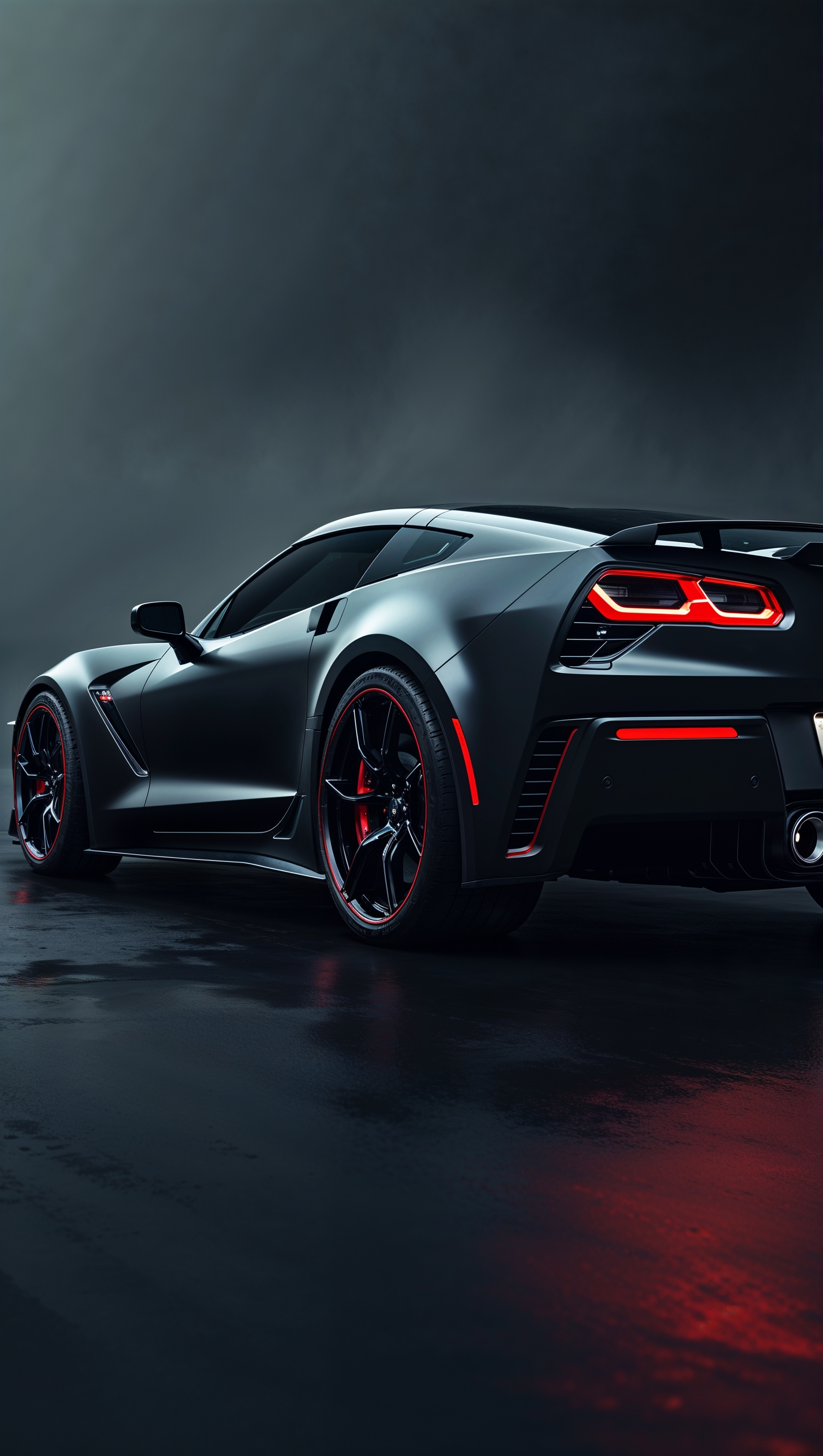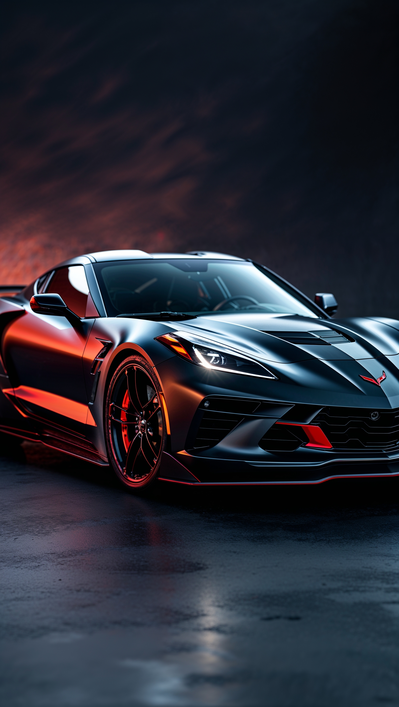 1664x2944 Matte black Corvette with red accents in low light, moody iPhone wallpaper