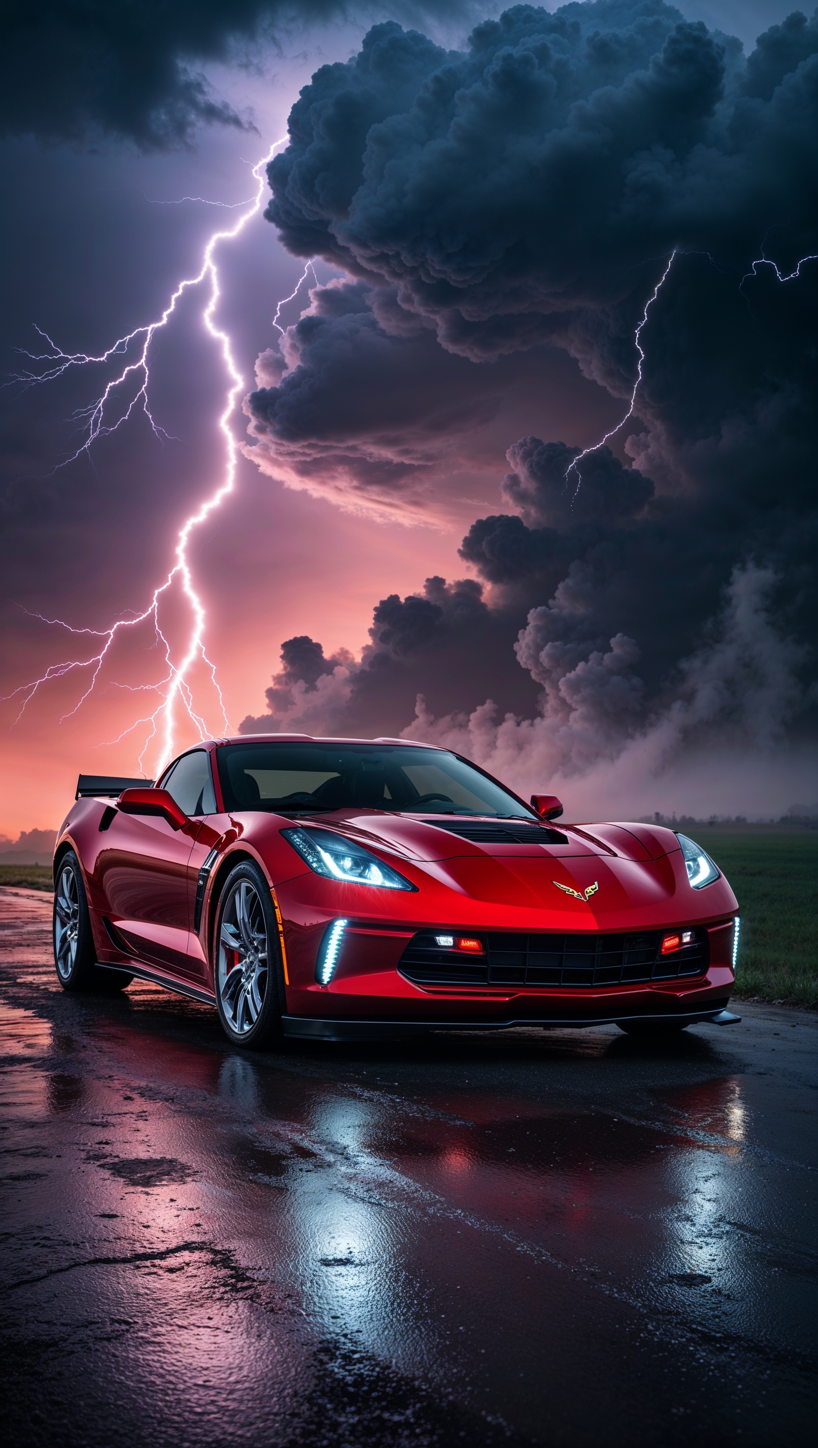 1664x2944 Corvette with thunder and lightning in the background, dramatic iPhone wallpaper
