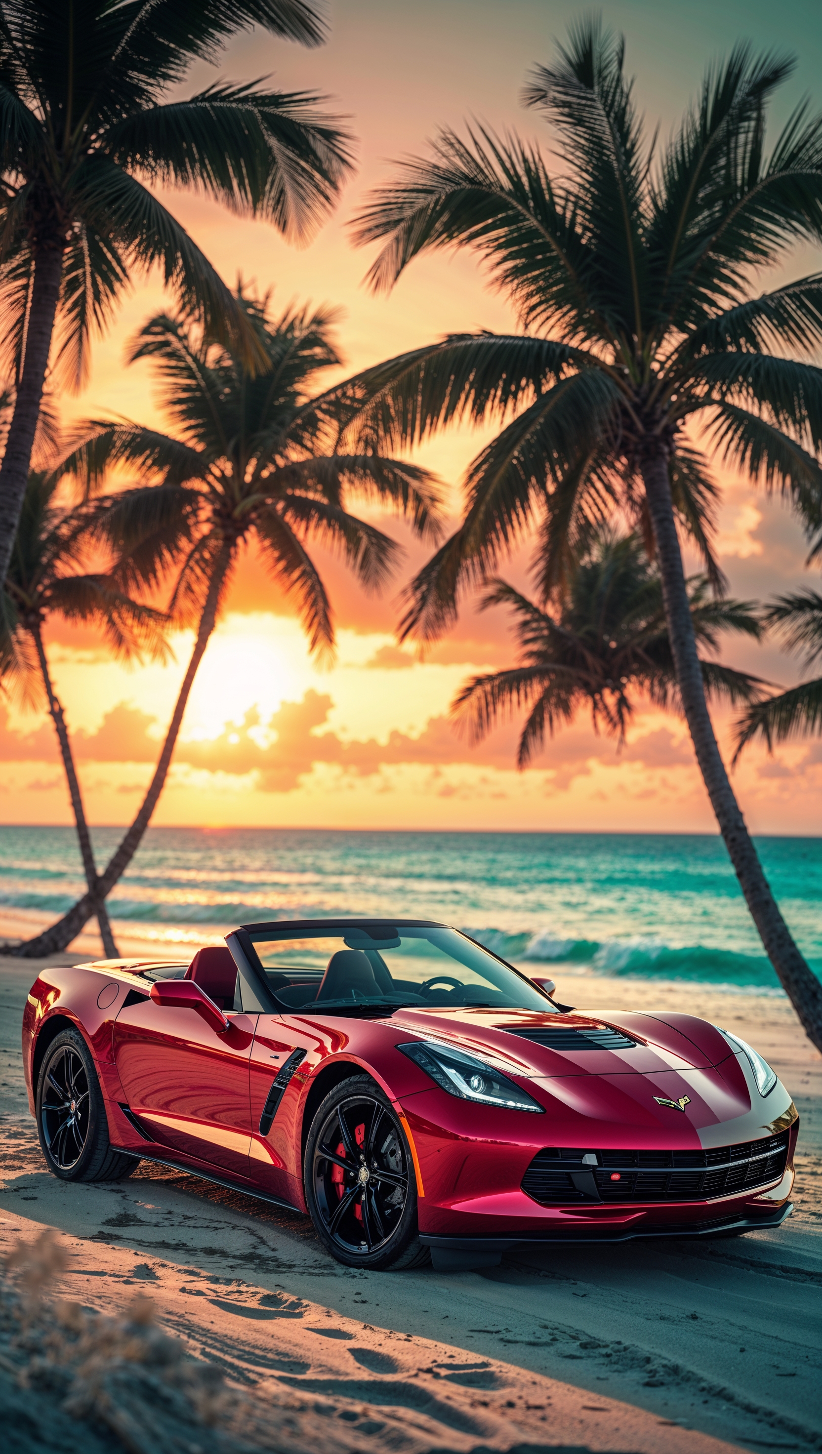 1664x2944 Corvette in a tropical beach scene, sunset and palm trees, summer iPhone wallpaper