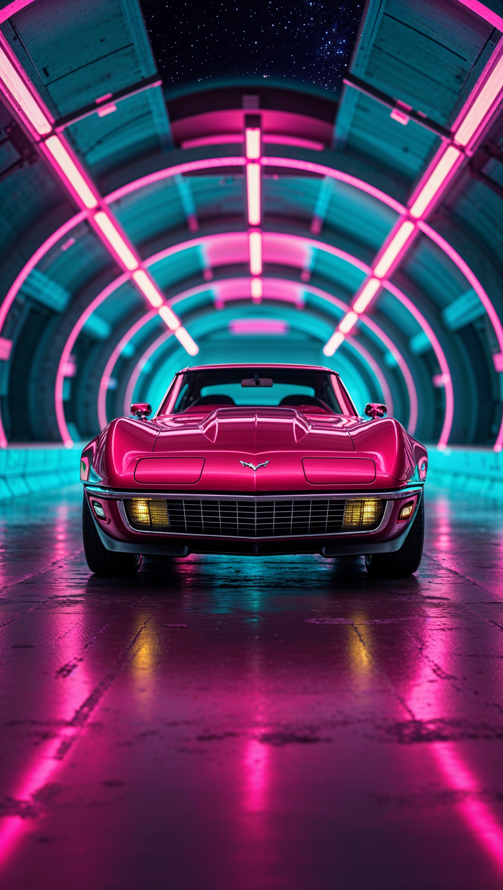 1664x2944 Corvette in a neon tunnel, retro-futuristic iPhone wallpaper