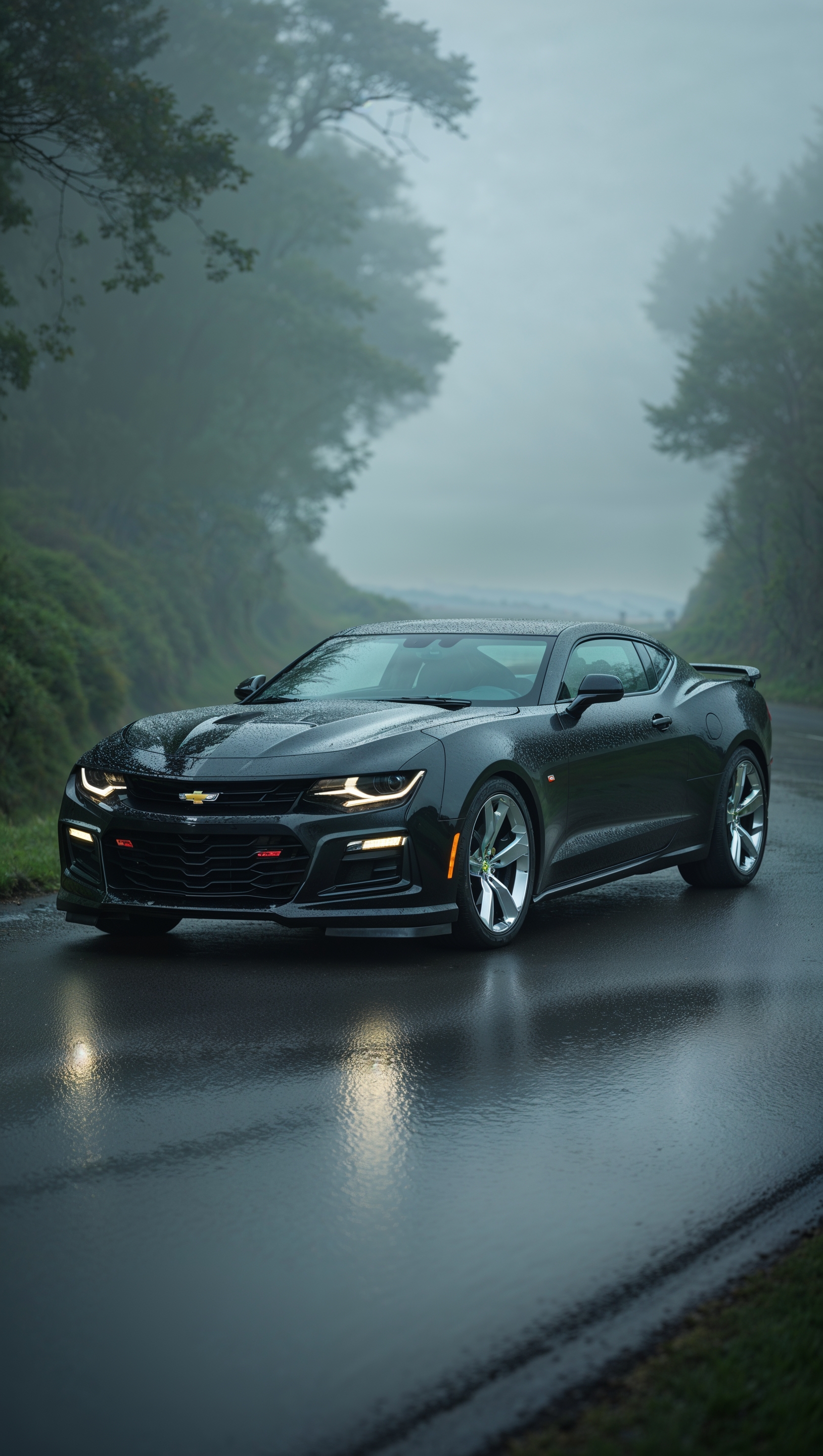 1664x2944 Camaro in morning fog, mysterious and calming vibe