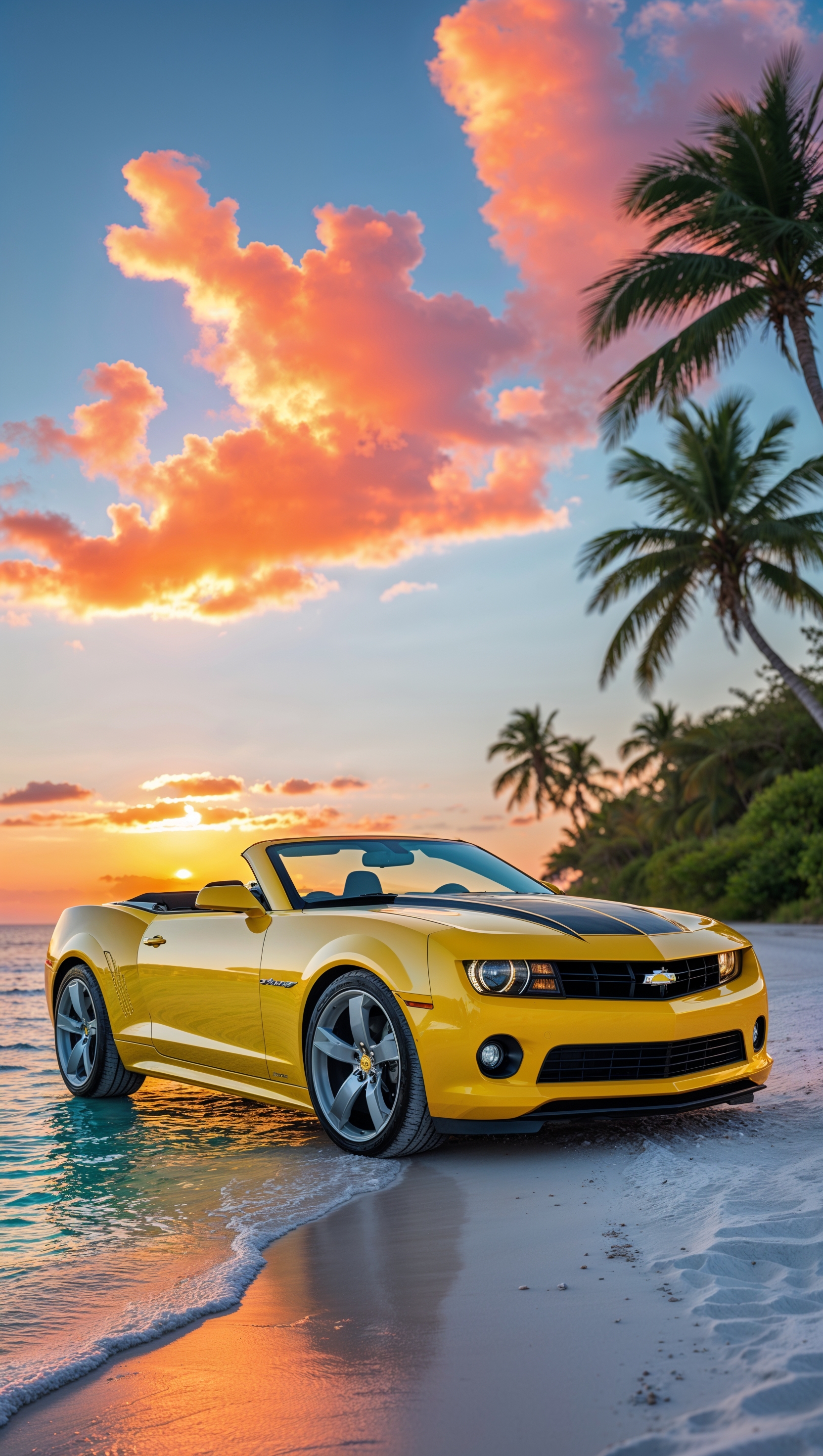 1664x2944 Yellow Camaro by the beach with a sunset sky