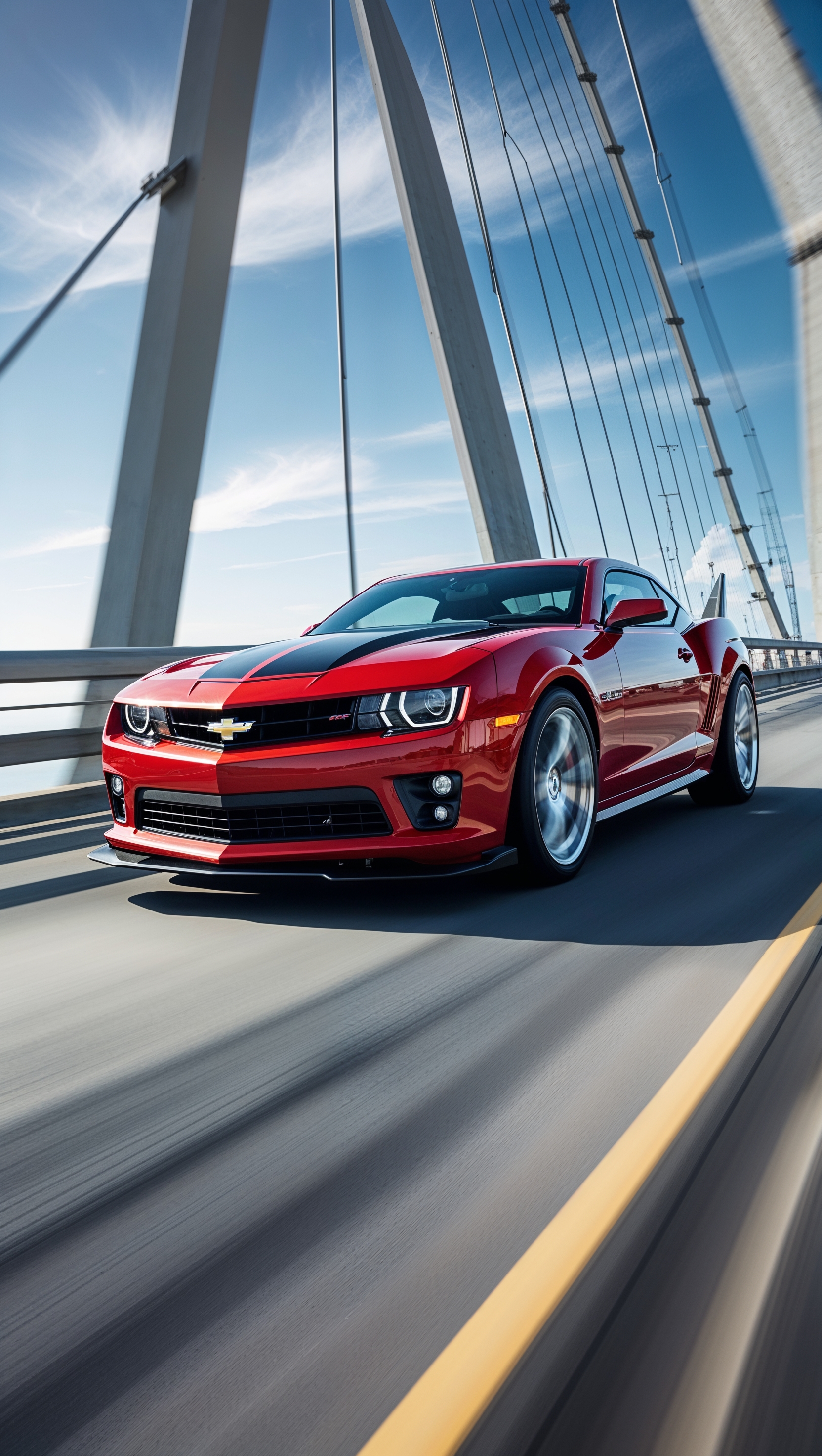 1664x2944 Camaro crossing a modern bridge, low angle view