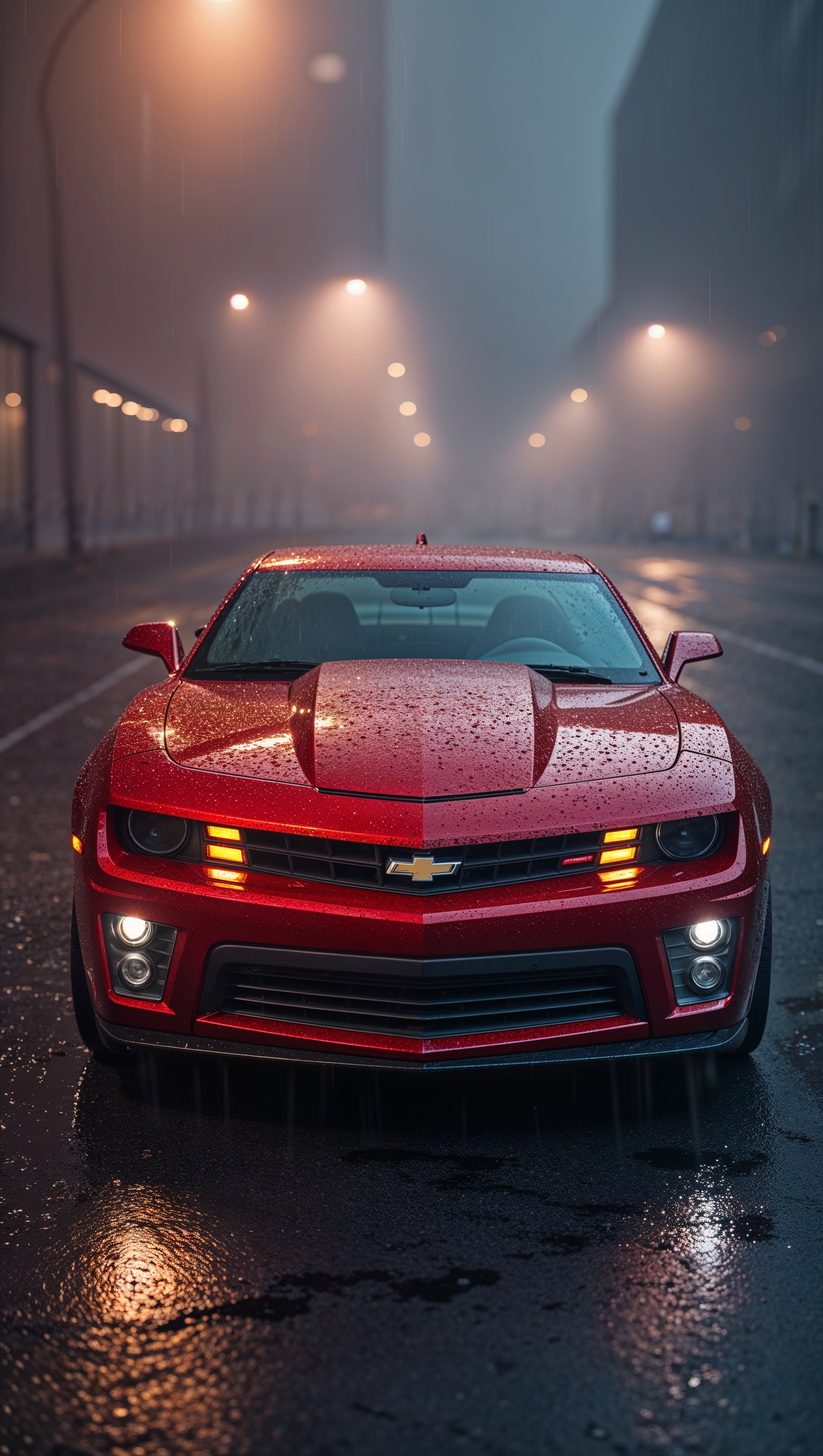 1664x2944 Red Camaro parked in the rain, light reflections on wet asphalt