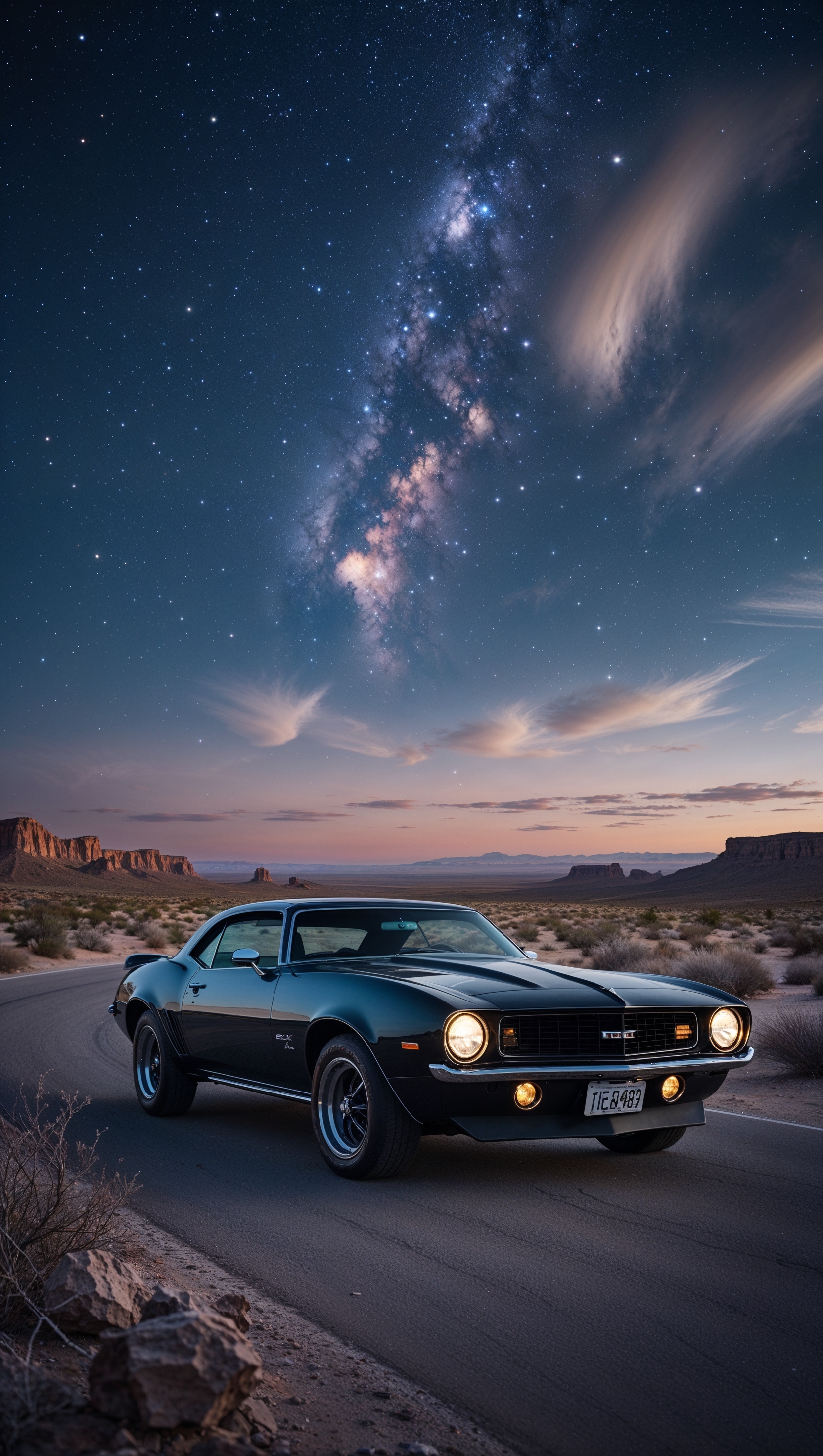 1664x2944 Black Camaro on a desert road with a starry night sky
