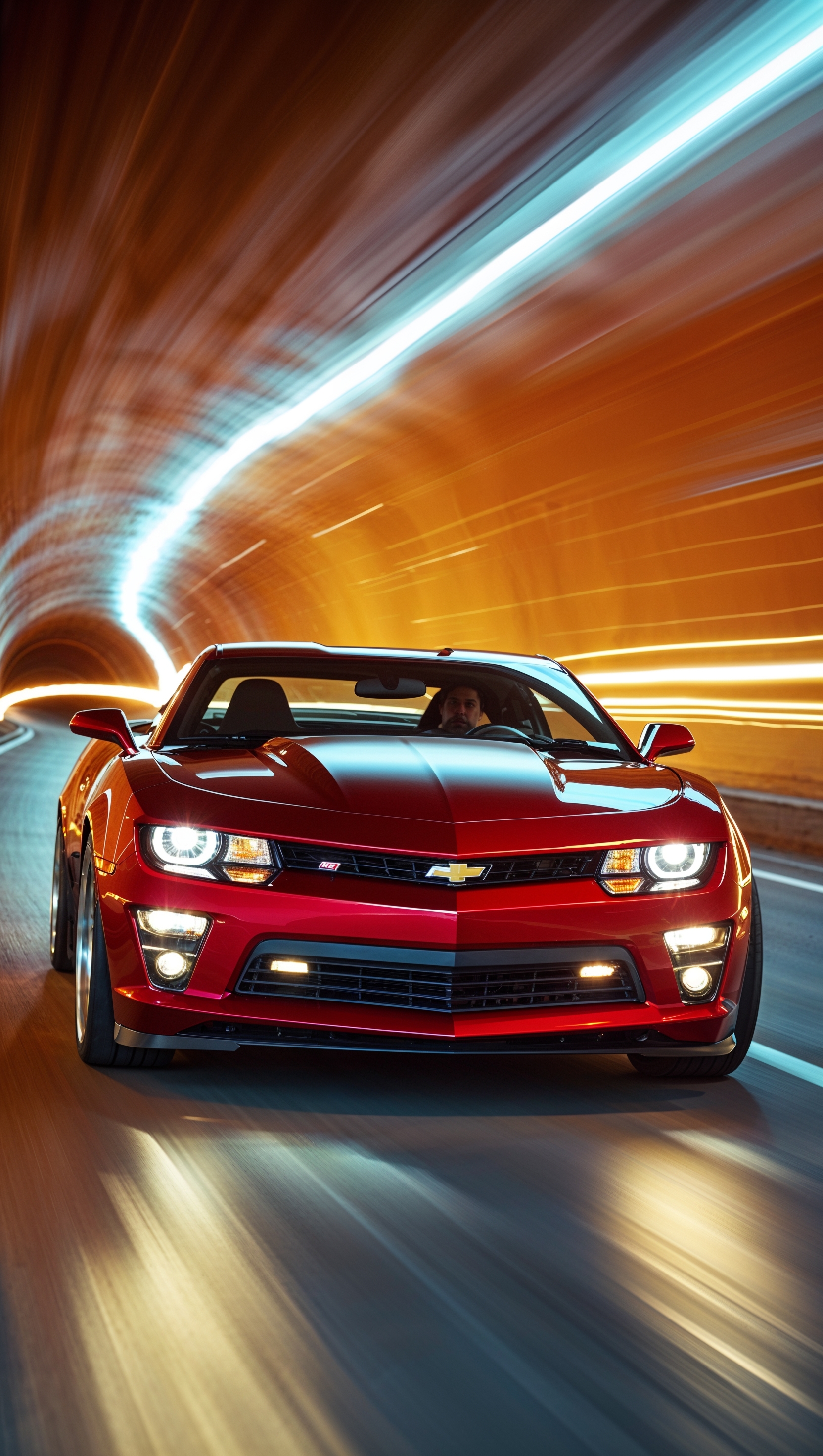 1664x2944 Camaro speeding through a glowing tunnel, high-speed effect
