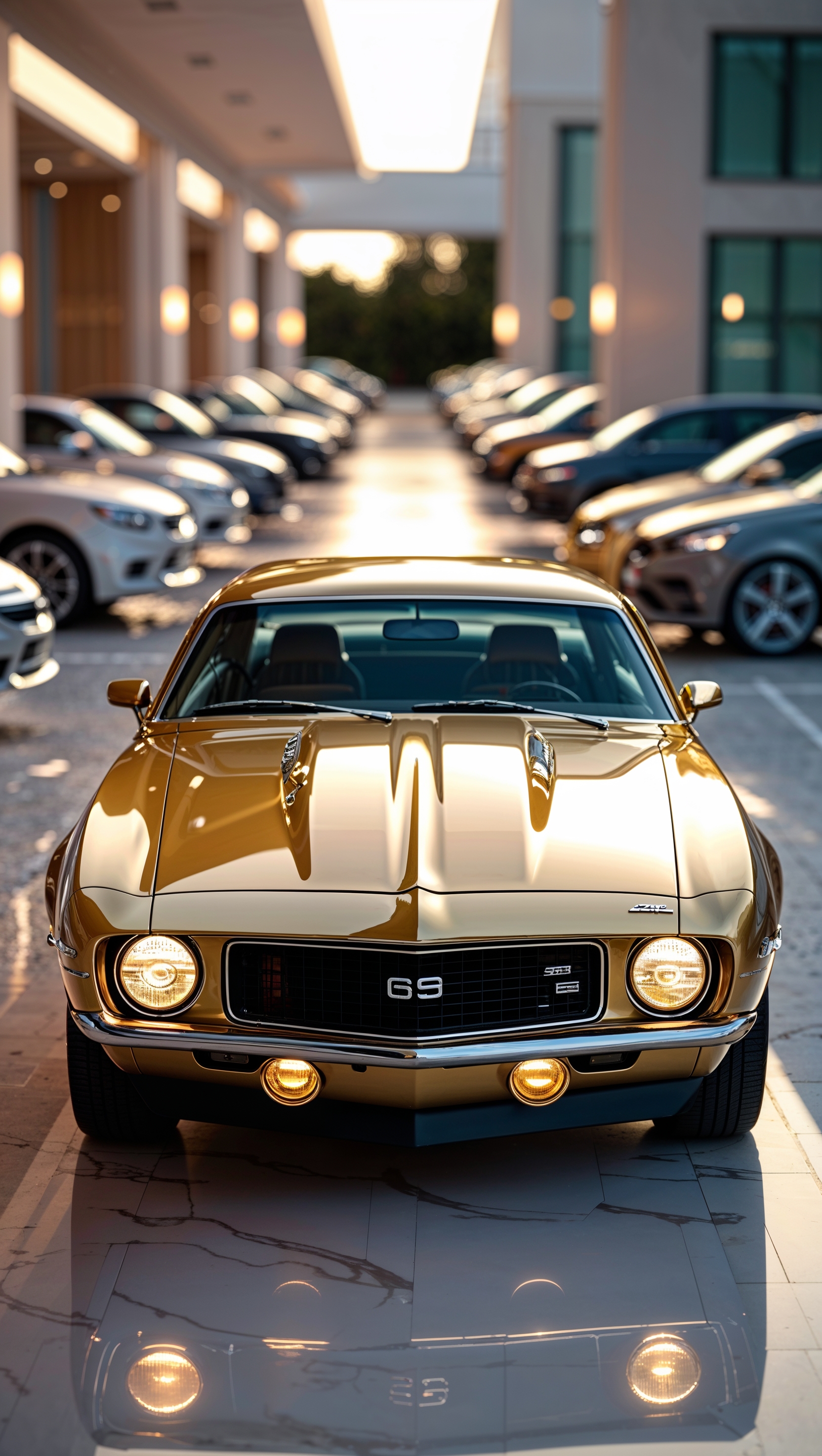 1664x2944 Golden Camaro in a luxury parking lot with soft lighting