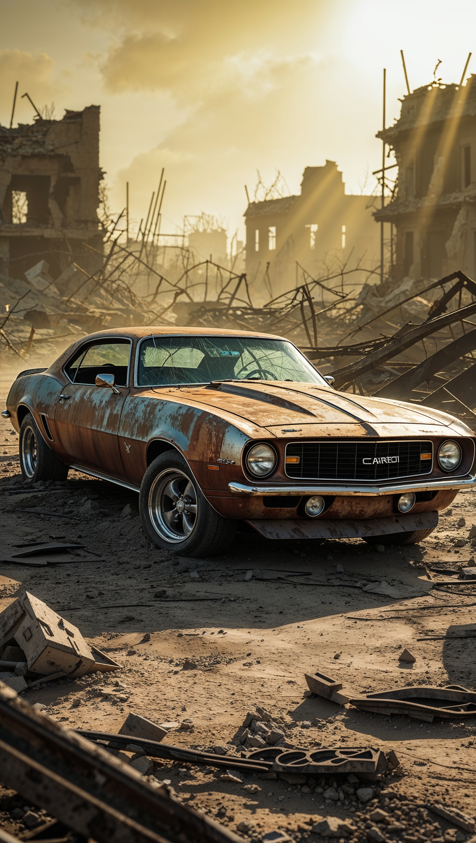 1664x2944 Camaro in a post-apocalyptic scene with dust and ruins