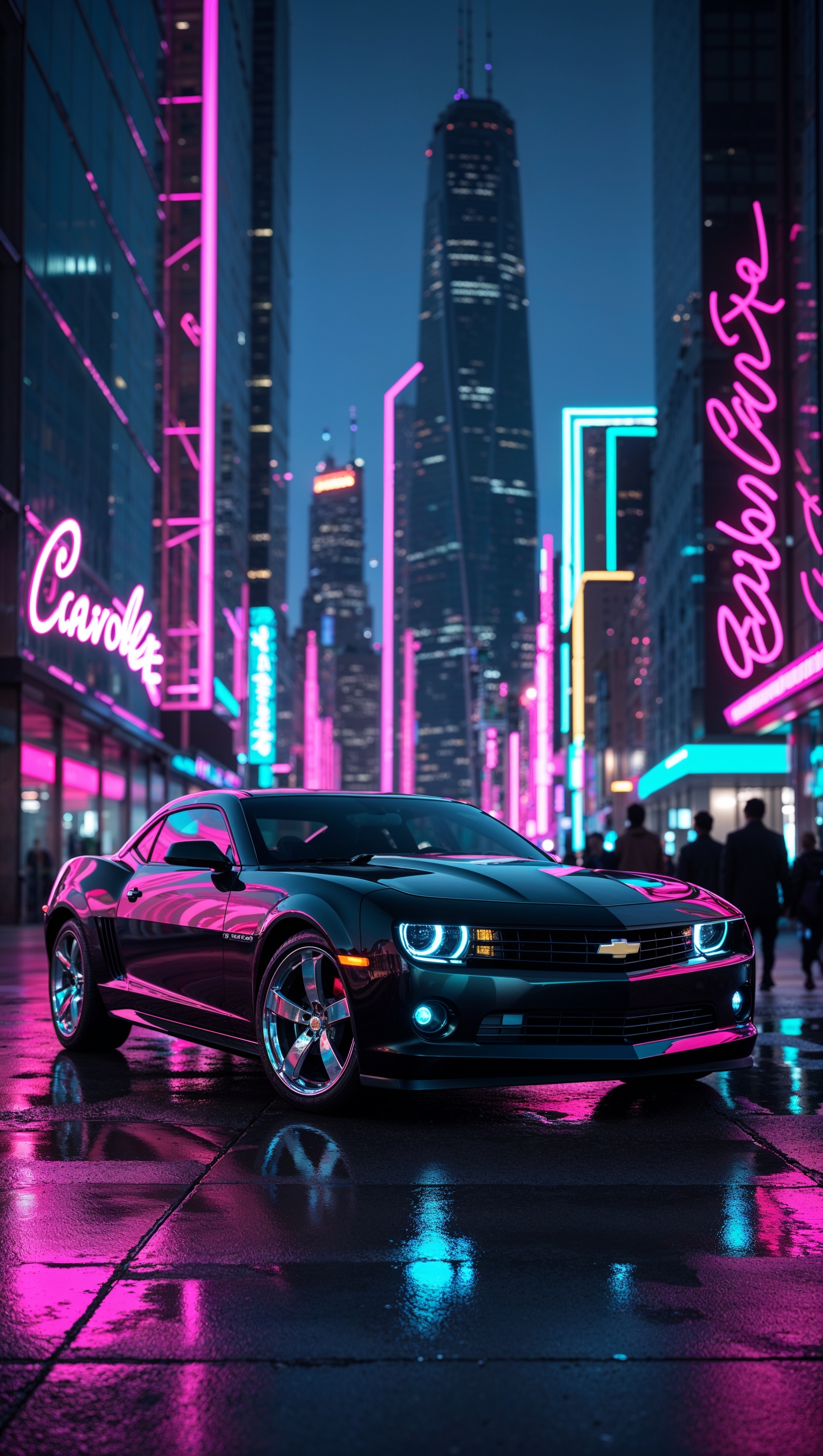 1664x2944 Camaro in front of skyscrapers at night, neon style