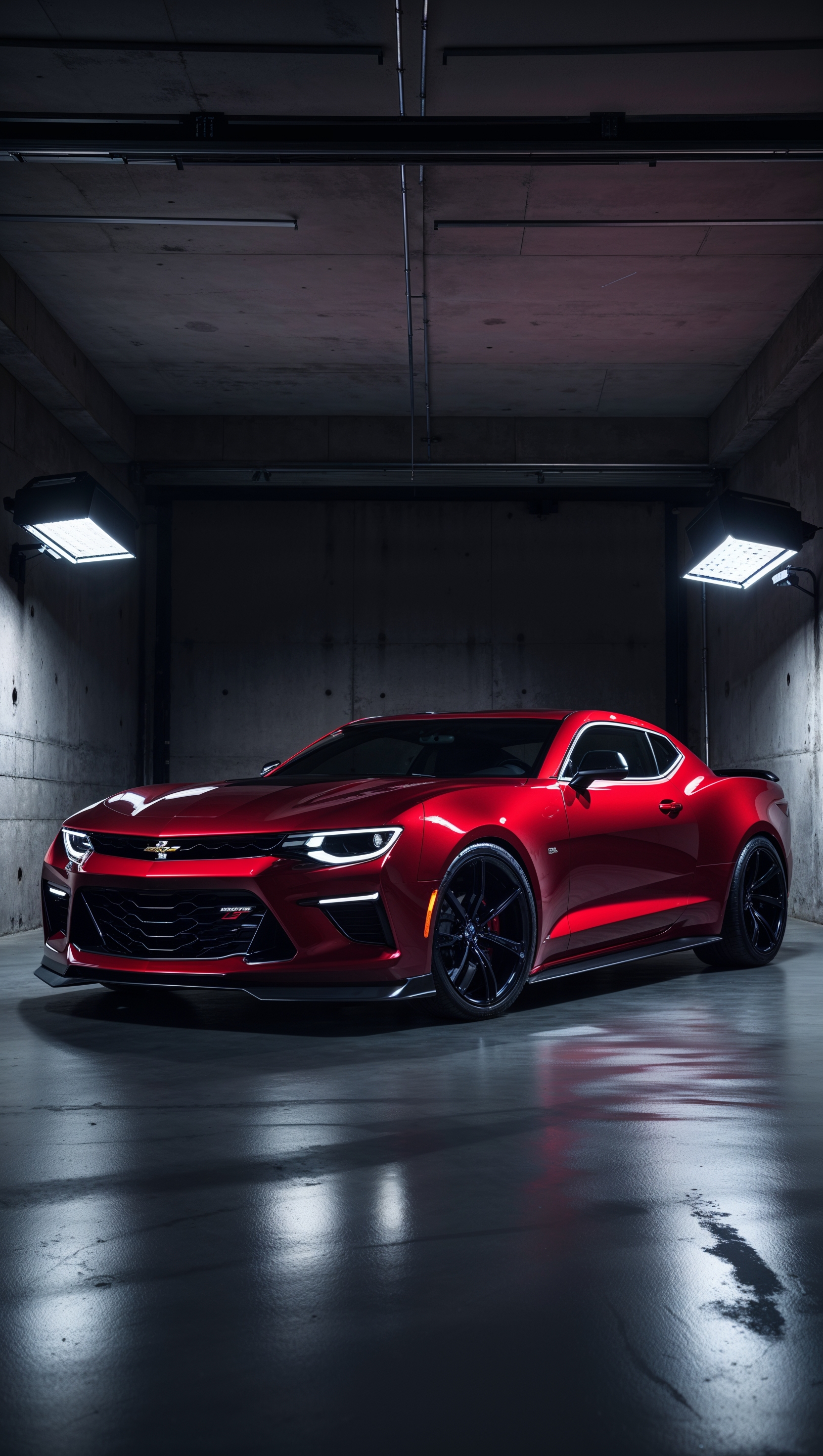 1664x2944 Close-up front view of a Camaro with blurred background, luxury design
