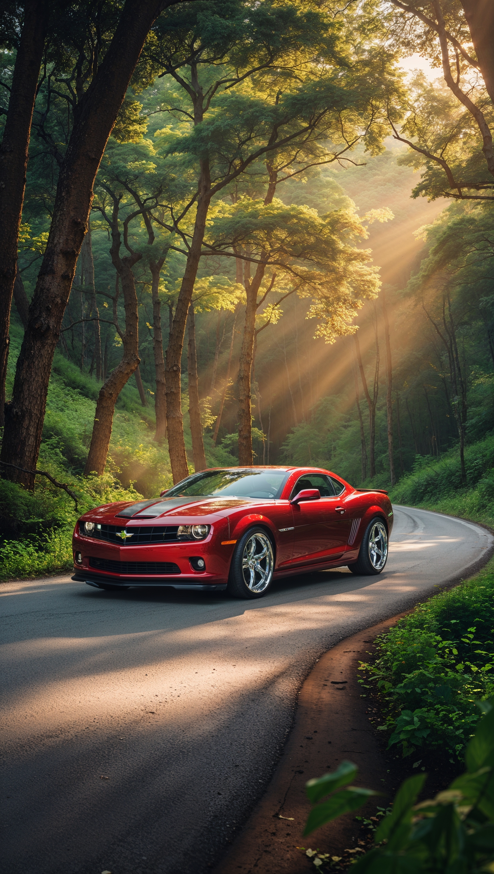 1664x2944 Camaro on a forest road with sunlight filtering through trees