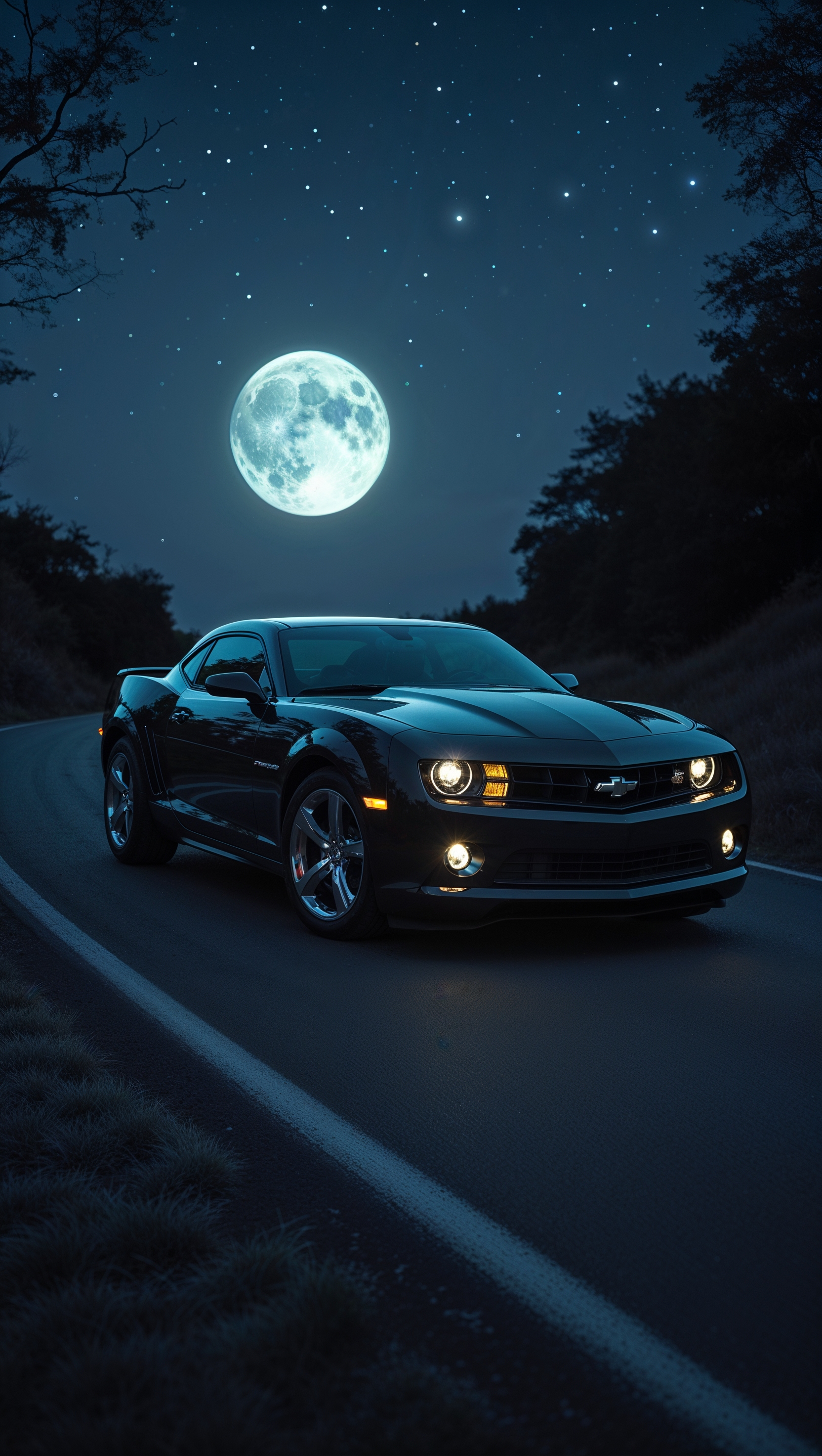 1664x2944 Night view of Camaro on an empty road, moonlight illumination