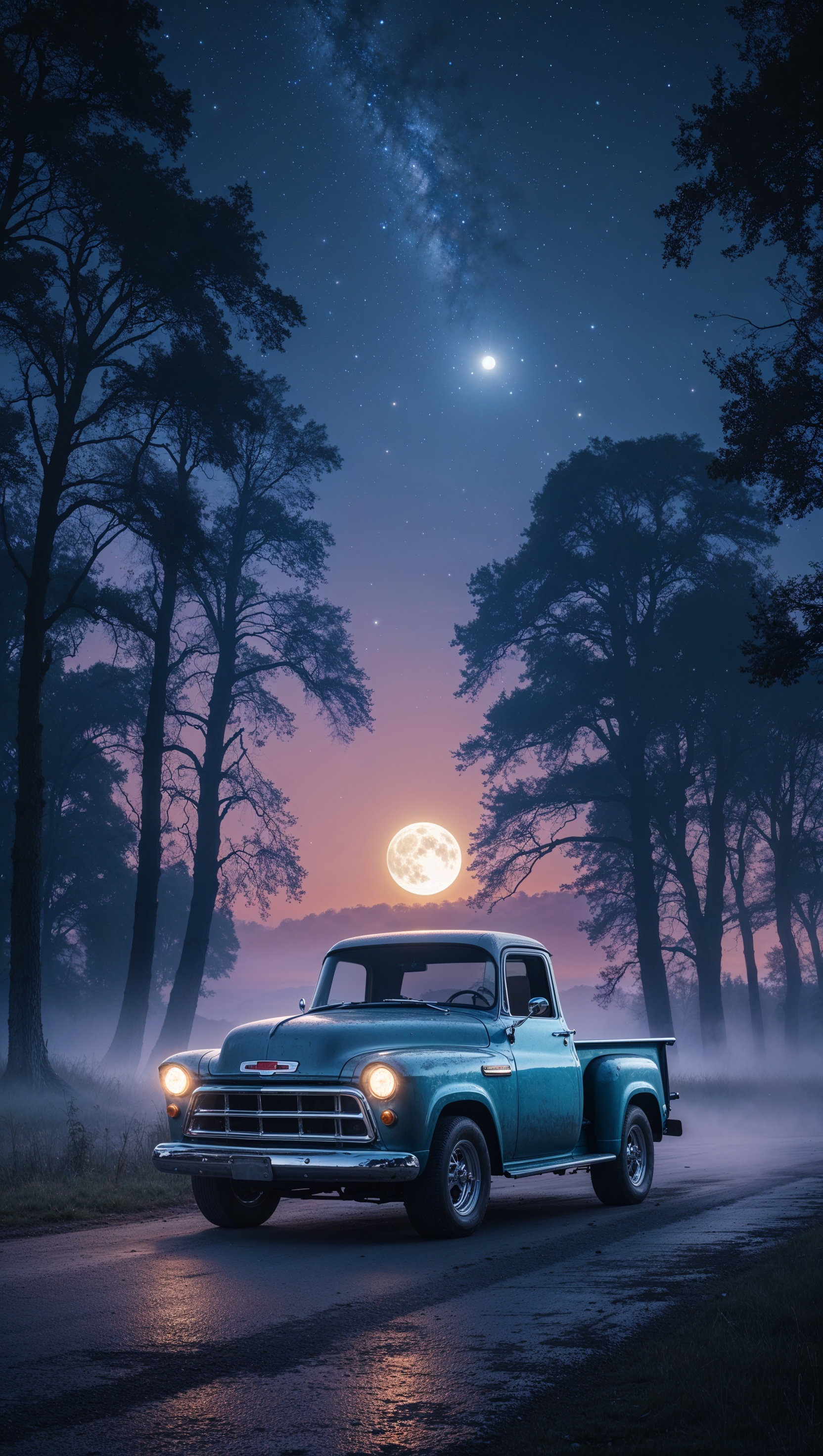 1664x2944 A night scene with a Chevy truck under starry skies, peaceful mood, iPhone wallpaper