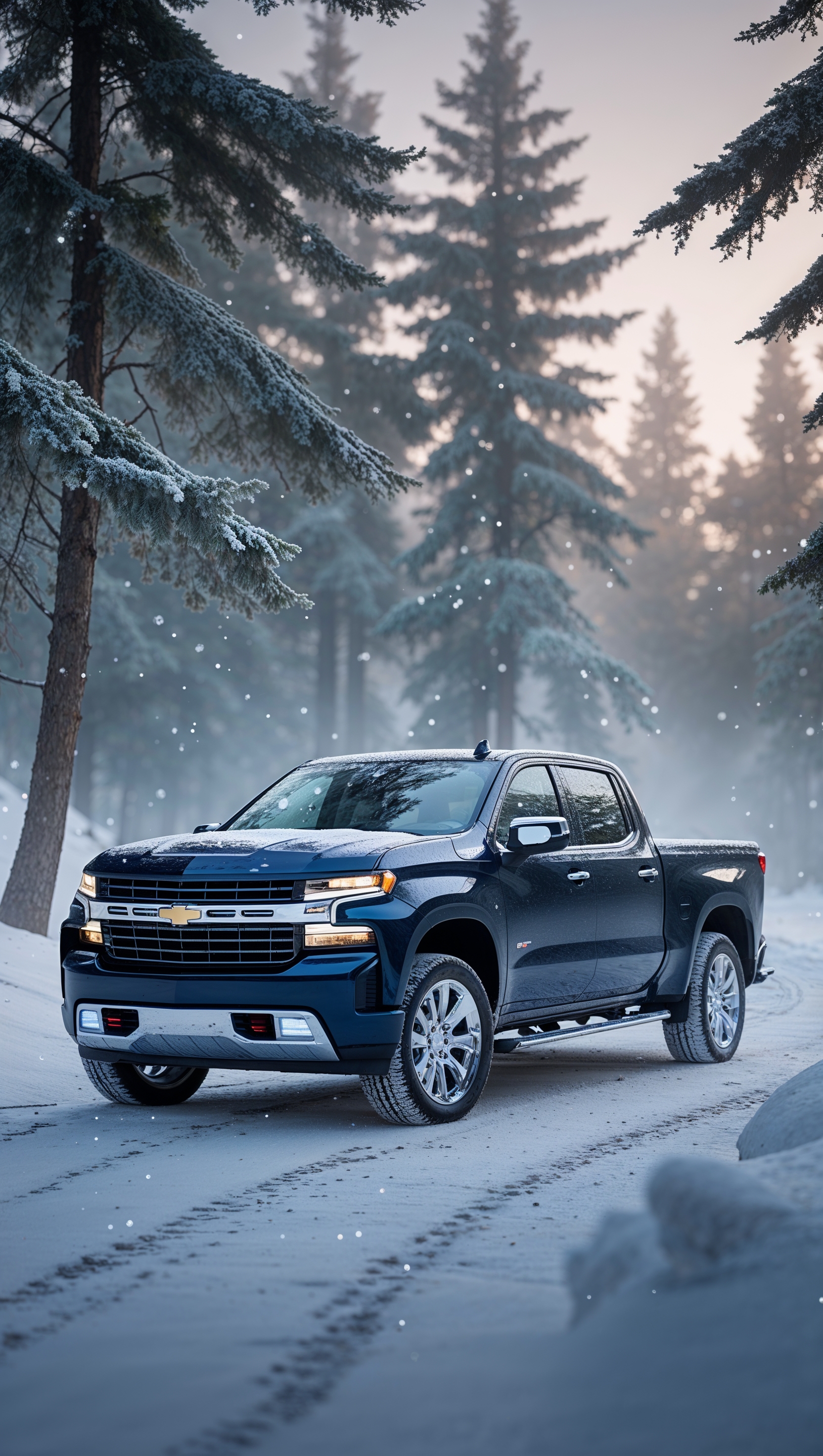1664x2944 Chevy Silverado in a snowy forest, peaceful winter landscape, iPhone wallpaper