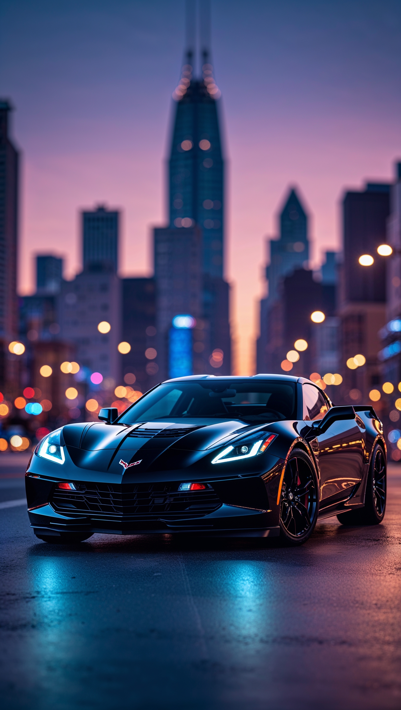 1664x2944 Black Chevy Corvette in front of a city skyline at dusk, moody atmosphere, iPhone wallpaper