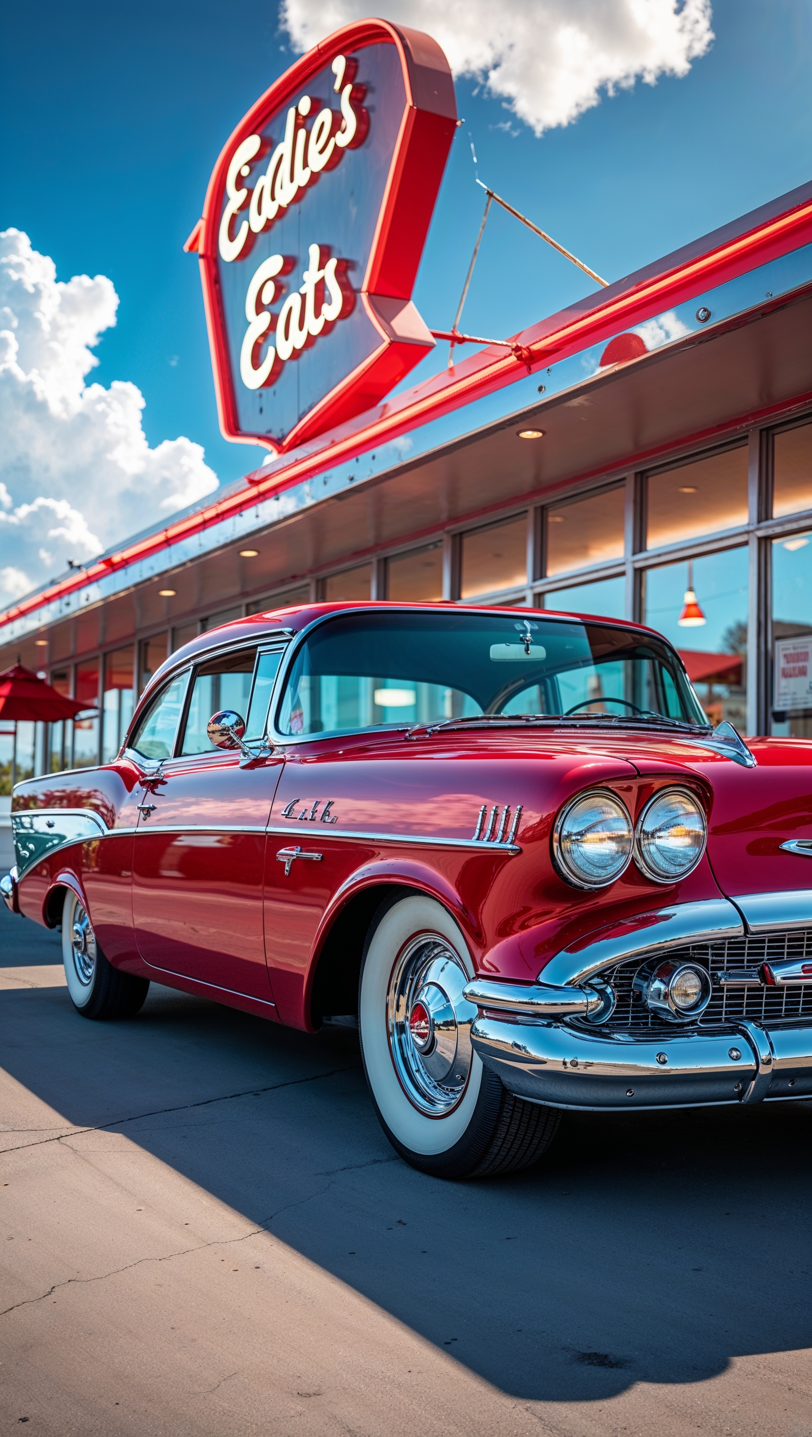 1664x2944 Vintage Chevy Impala parked in front of a diner, 1950s vibe, iPhone wallpaper