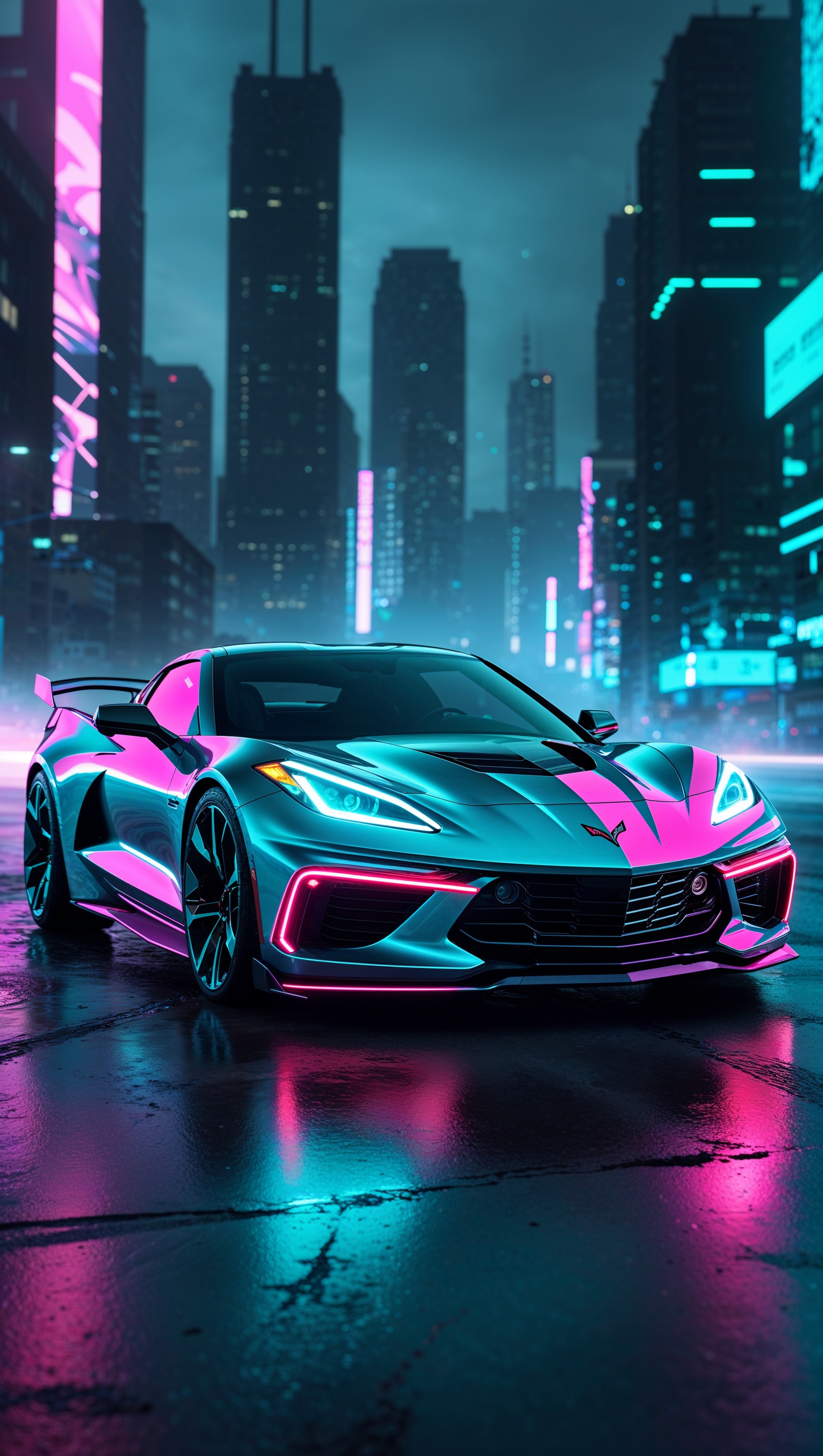 1664x2944 Futuristic Chevy Corvette glowing in neon lights at night, cyberpunk style, iPhone wallpaper