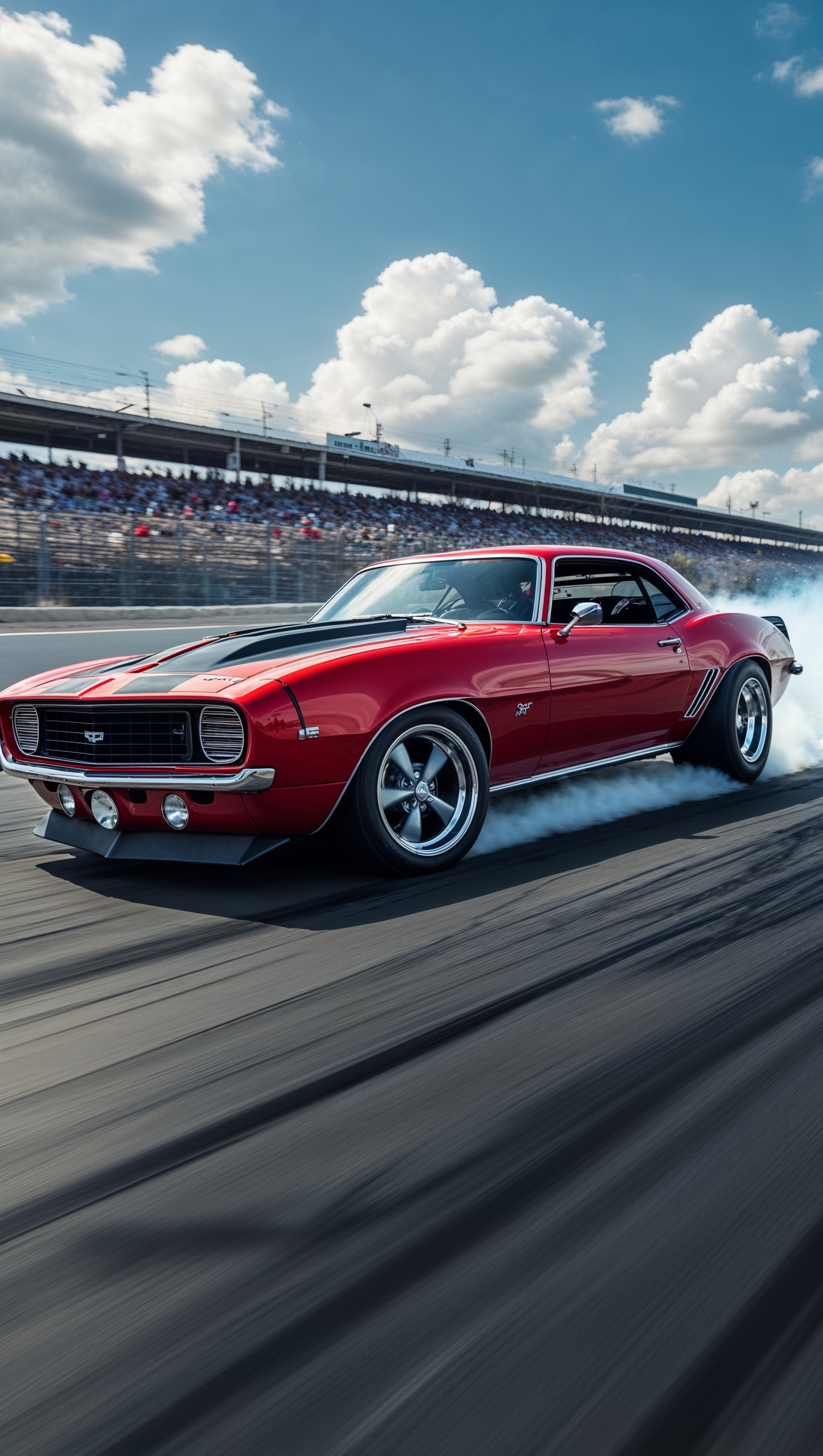 1664x2944 A Chevy muscle car drifting on a racetrack, motion blur effect, iPhone wallpaper