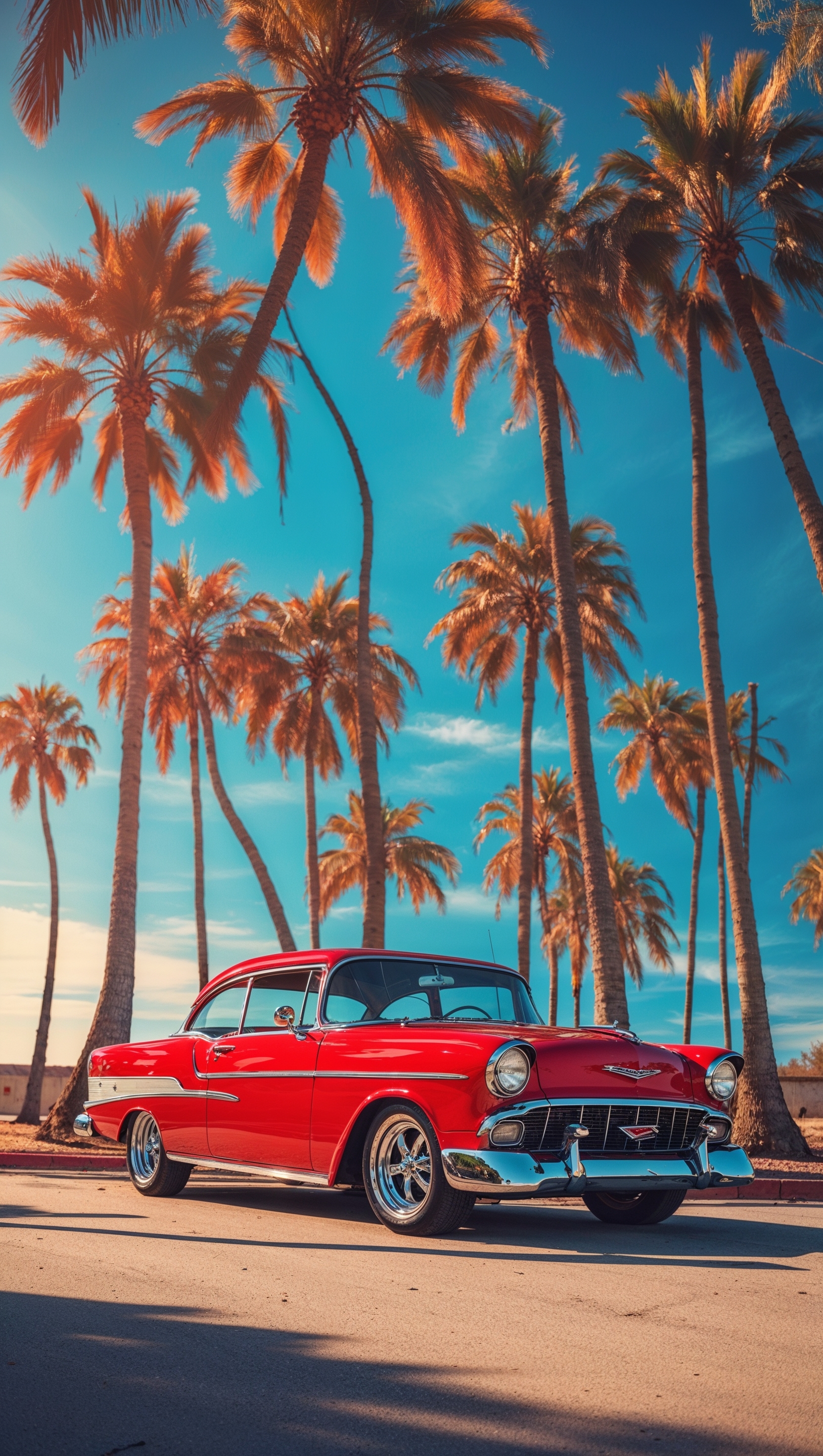 1664x2944 Chevy Bel Air from the 1950s parked under palm trees, retro filter, iPhone wallpaper