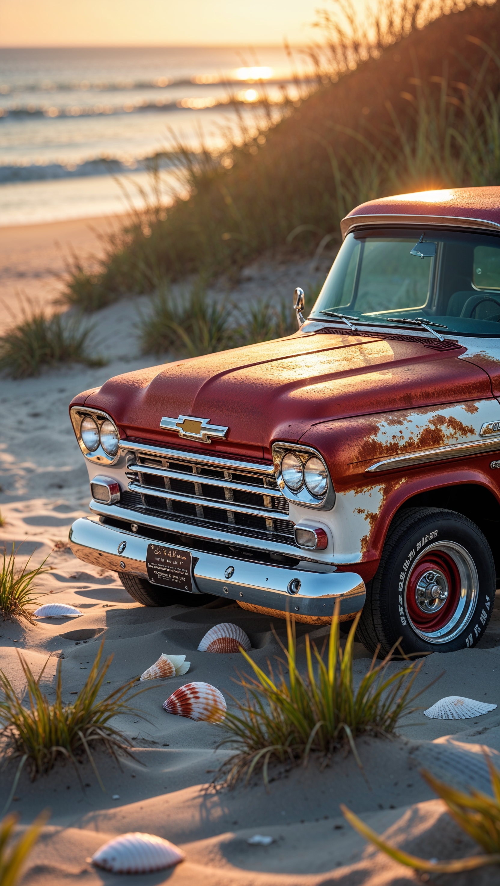 1664x2944 Chevy truck parked on a beach during golden hour, relaxed vibe, iPhone wallpaper