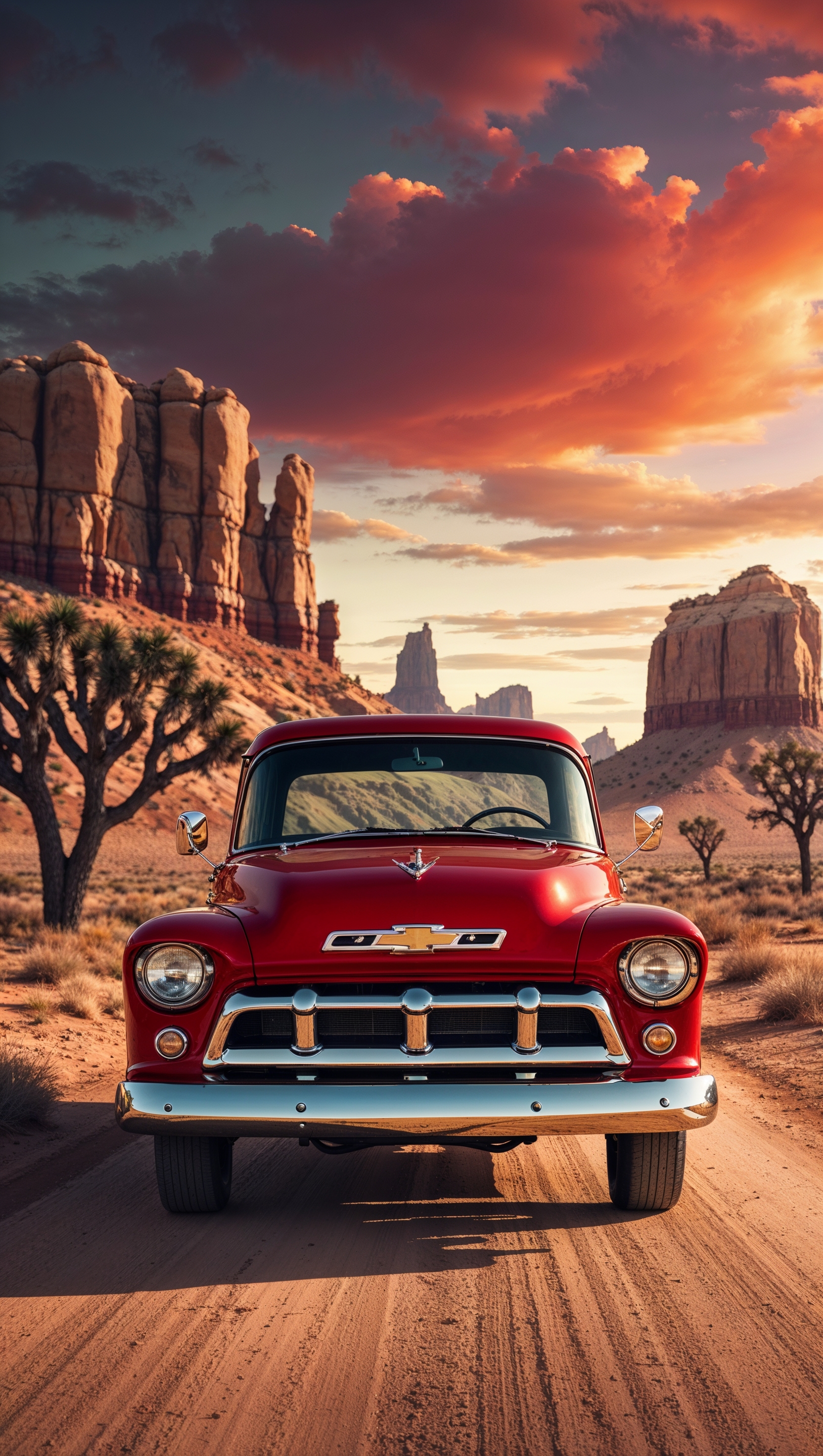 1664x2944 A red Chevy truck driving through the desert, cinematic lighting, iPhone wallpaper