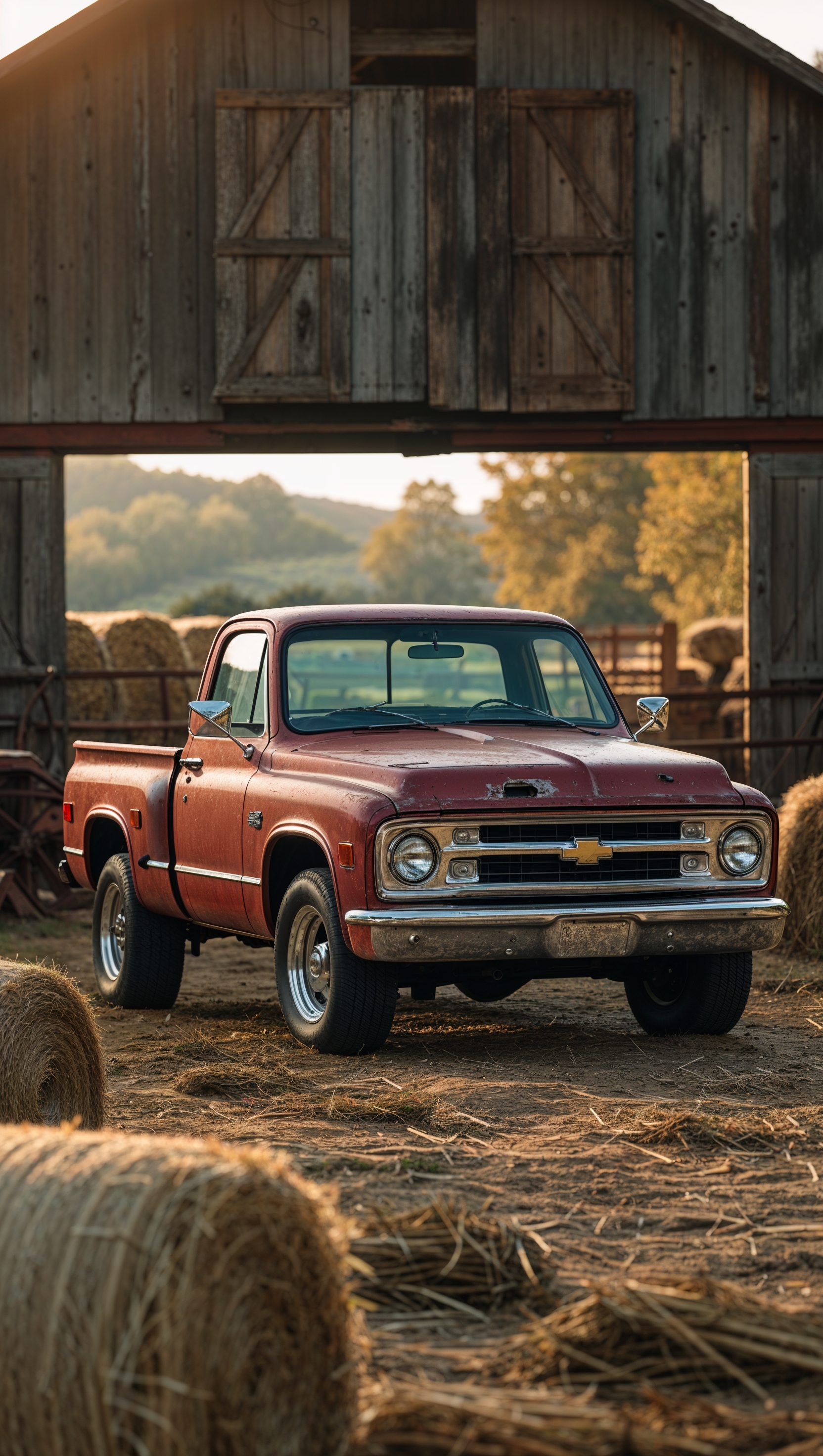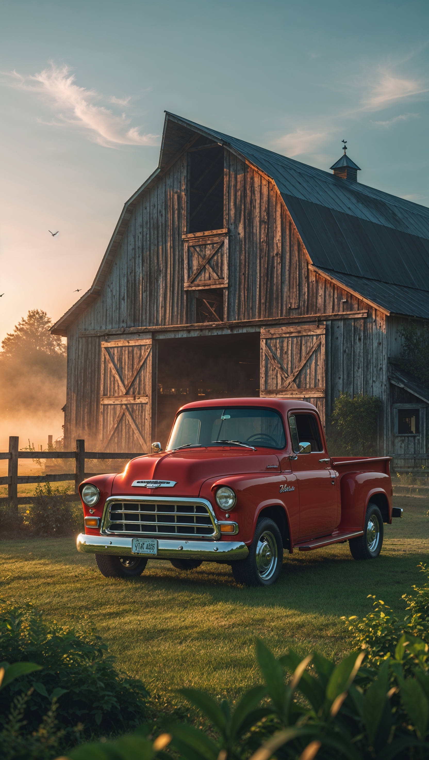 1664x2944 Chevy truck in front of a barn during sunrise, peaceful country scene, iPhone wallpaper