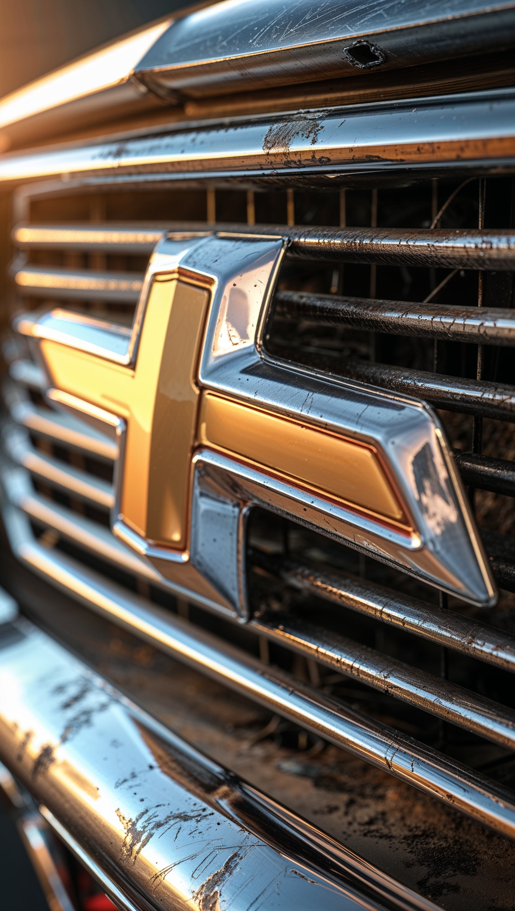 1664x2944 Close-up shot of a classic Chevy logo on a chrome grill, vintage detail, iPhone wallpaper