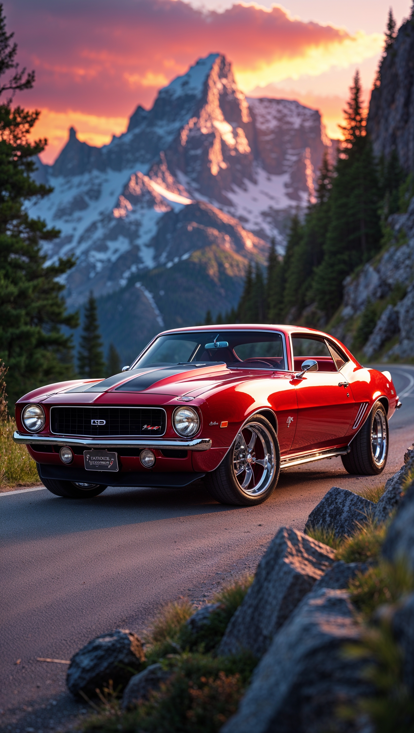 1664x2944 A classic Chevy Camaro on a mountain road during sunset, ultra HD, iPhone wallpaper