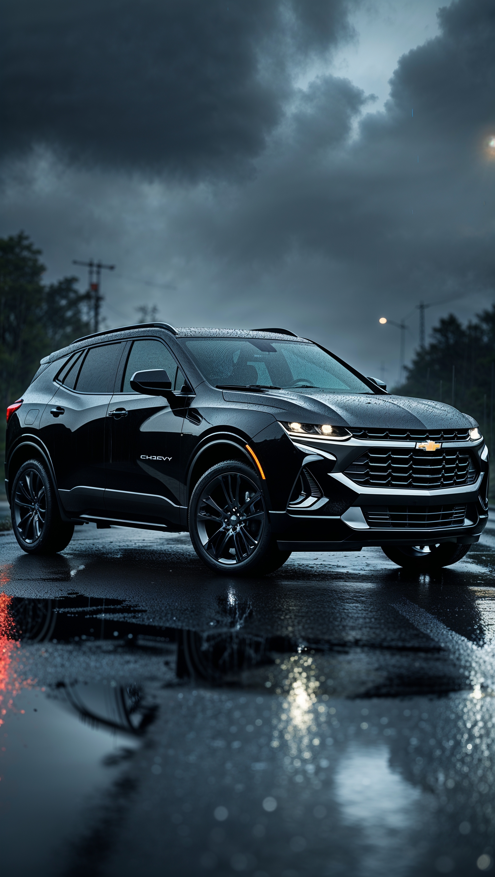 1664x2944 A sleek black Chevy SUV on a rainy road, dramatic lighting, iPhone wallpaper