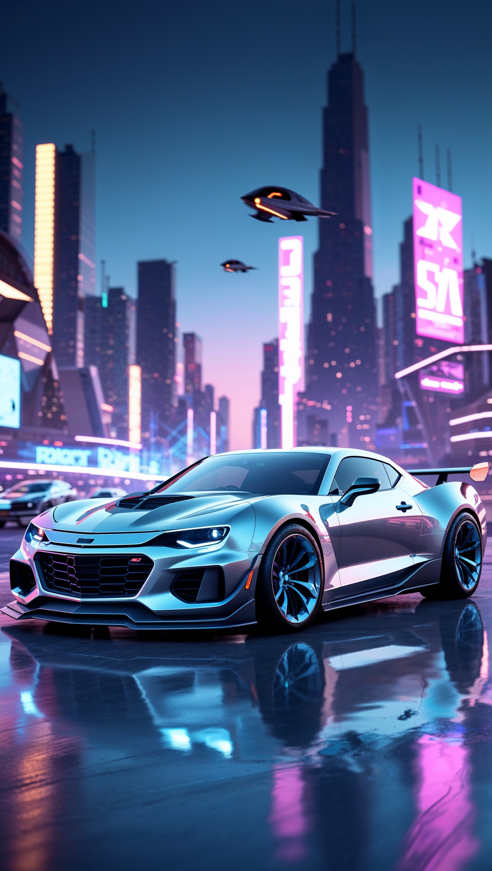 1664x2944 A silver Chevy sports car in front of a futuristic city, sci-fi vibe, iPhone wallpaper