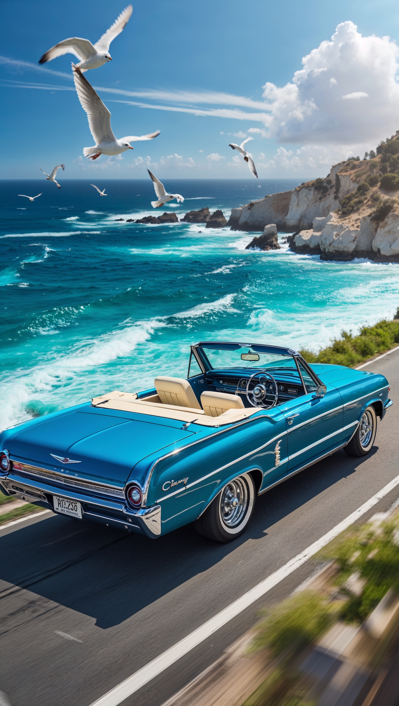 1664x2944 A blue Chevy convertible driving along the coast, summer vibes, iPhone wallpaper