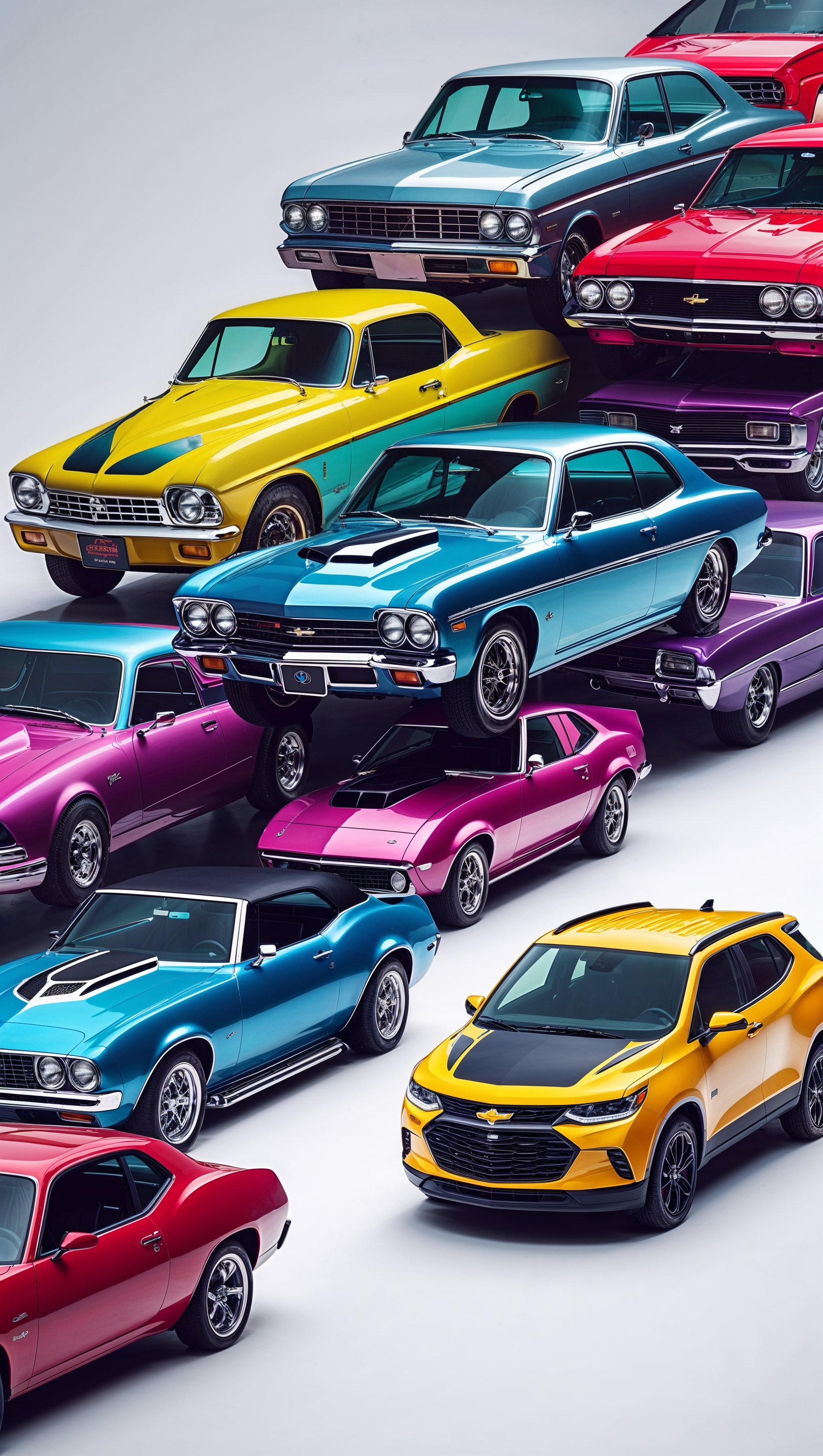 1664x2944 A lineup of different Chevy models from each decade, collage style, iPhone wallpaper