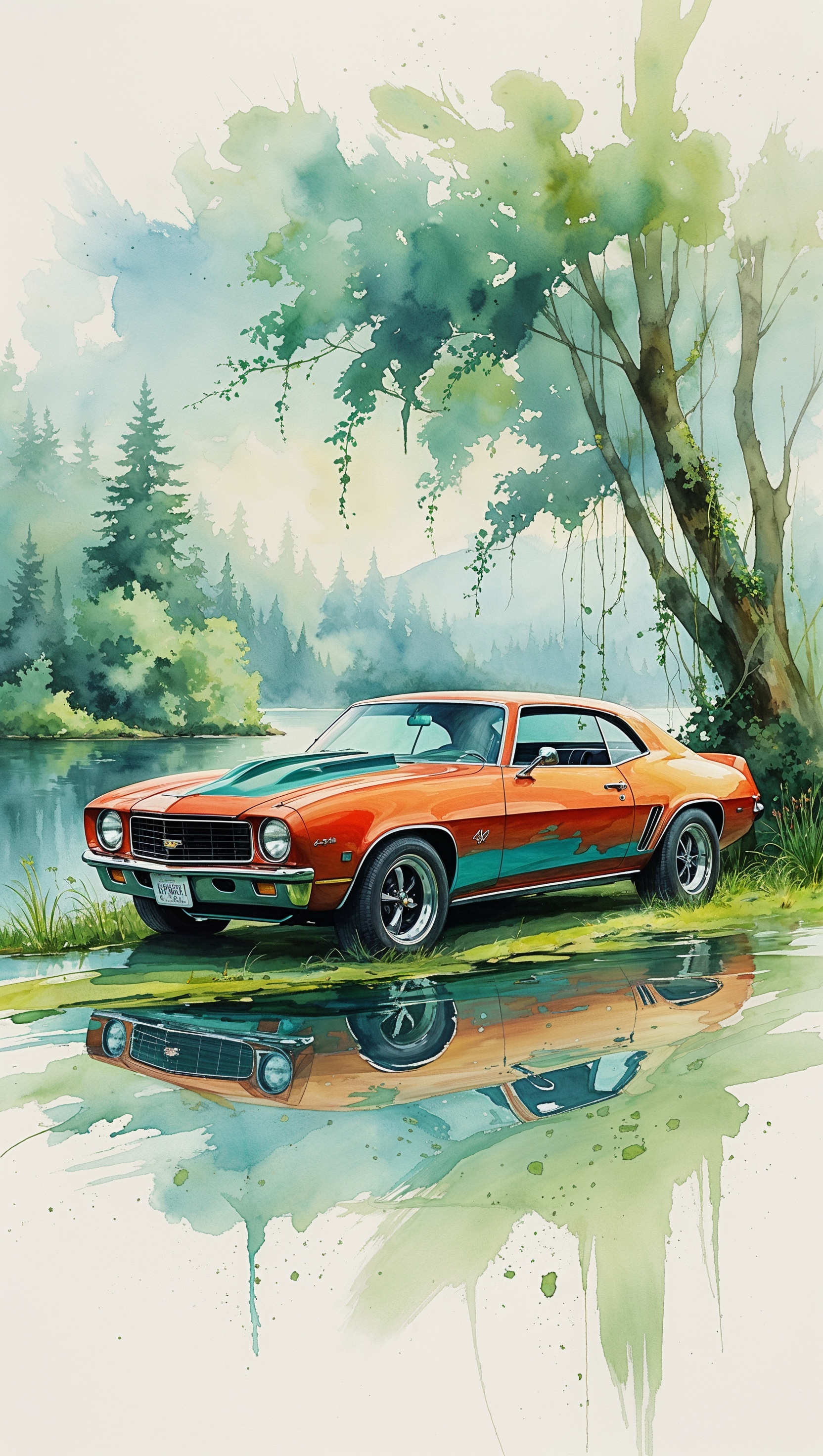 1664x2944 Artistic watercolor painting of a Chevy in nature, artistic background, iPhone wallpaper