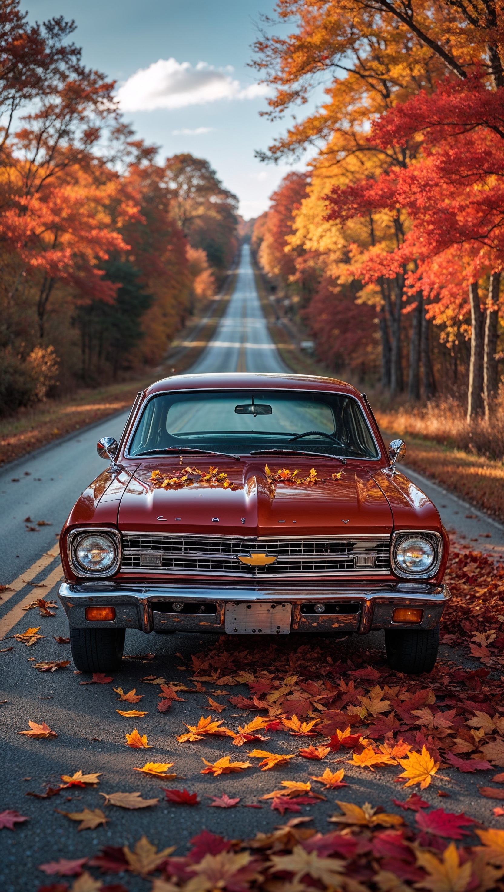 1664x2944 Chevy Nova surrounded by autumn leaves on a quiet road, cozy feeling, iPhone wallpaper
