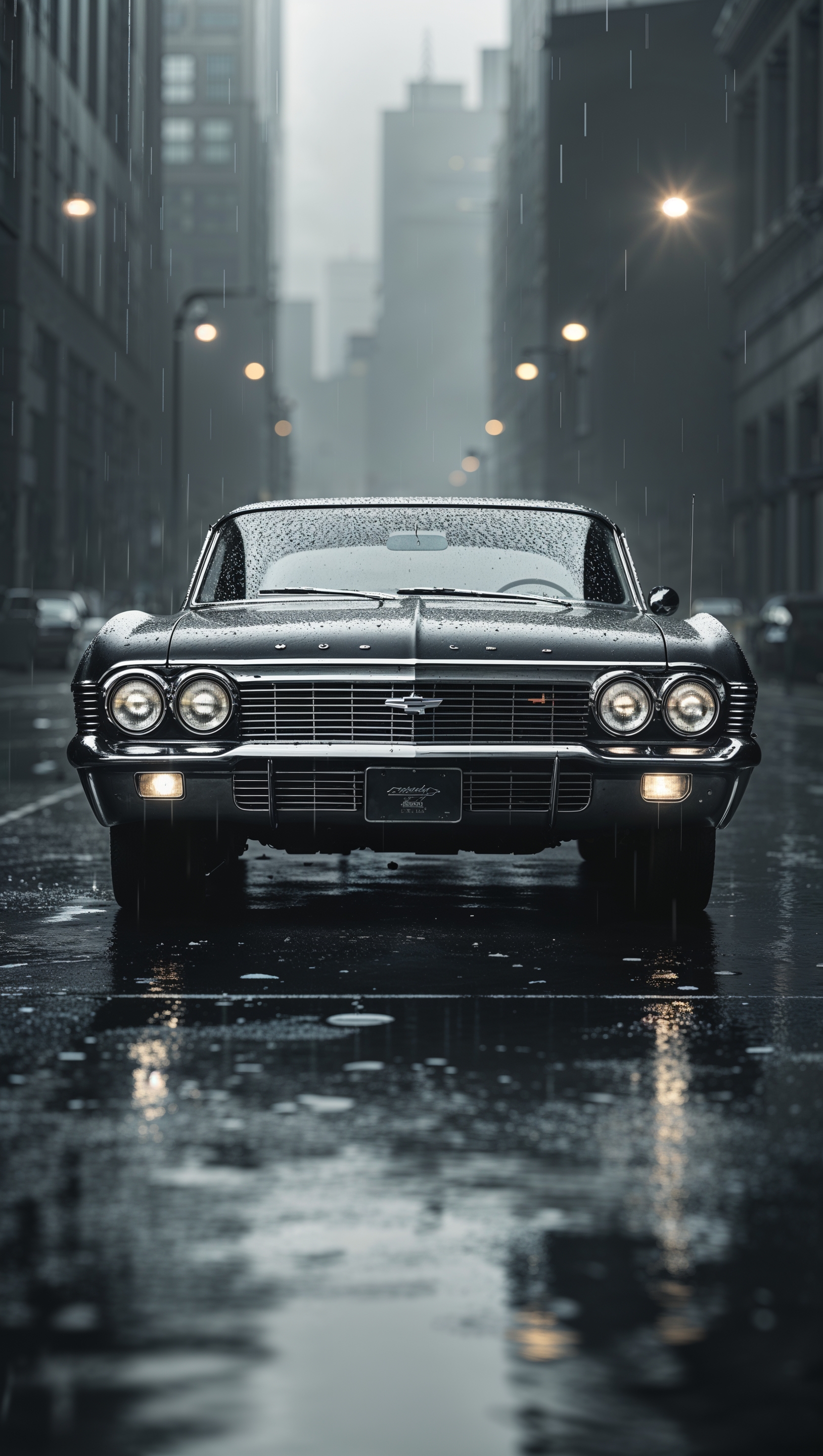 1664x2944 Moody black-and-white photo of a classic Chevy in the rain, vintage film look, iPhone wallpaper