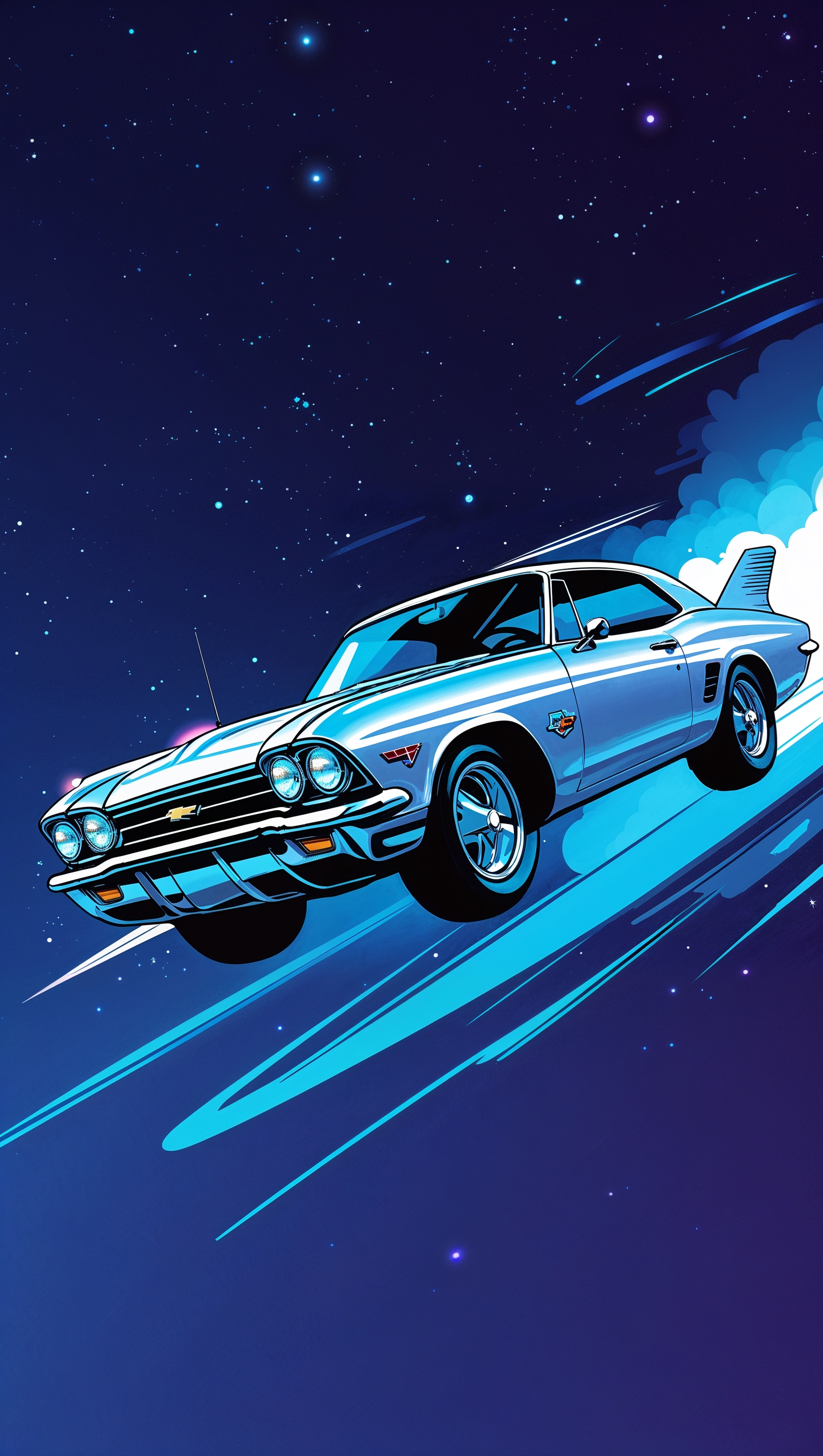 1664x2944 Retro-futuristic illustration of a Chevy flying car, sci-fi art style, iPhone wallpaper