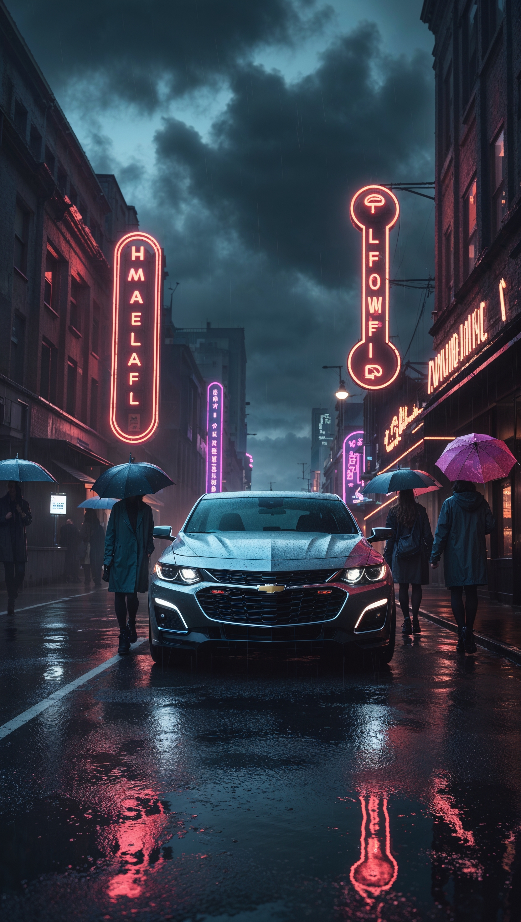 1664x2944 A rainy city street with a Chevy Malibu reflecting neon lights, moody and stylish, iPhone wallpaper