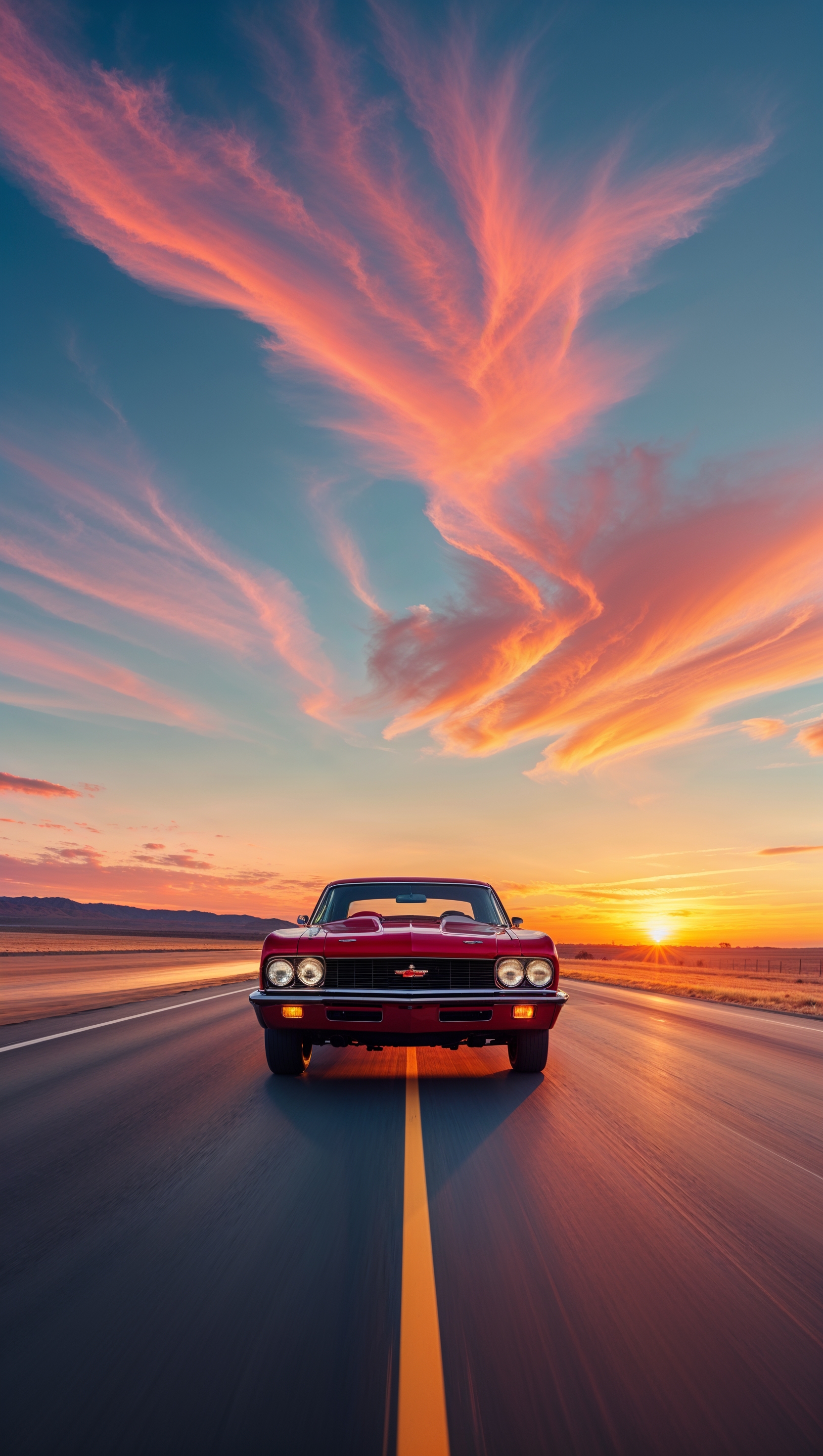 1664x2944 Epic sunset behind a Chevy on a long open highway, dramatic colors, iPhone wallpaper