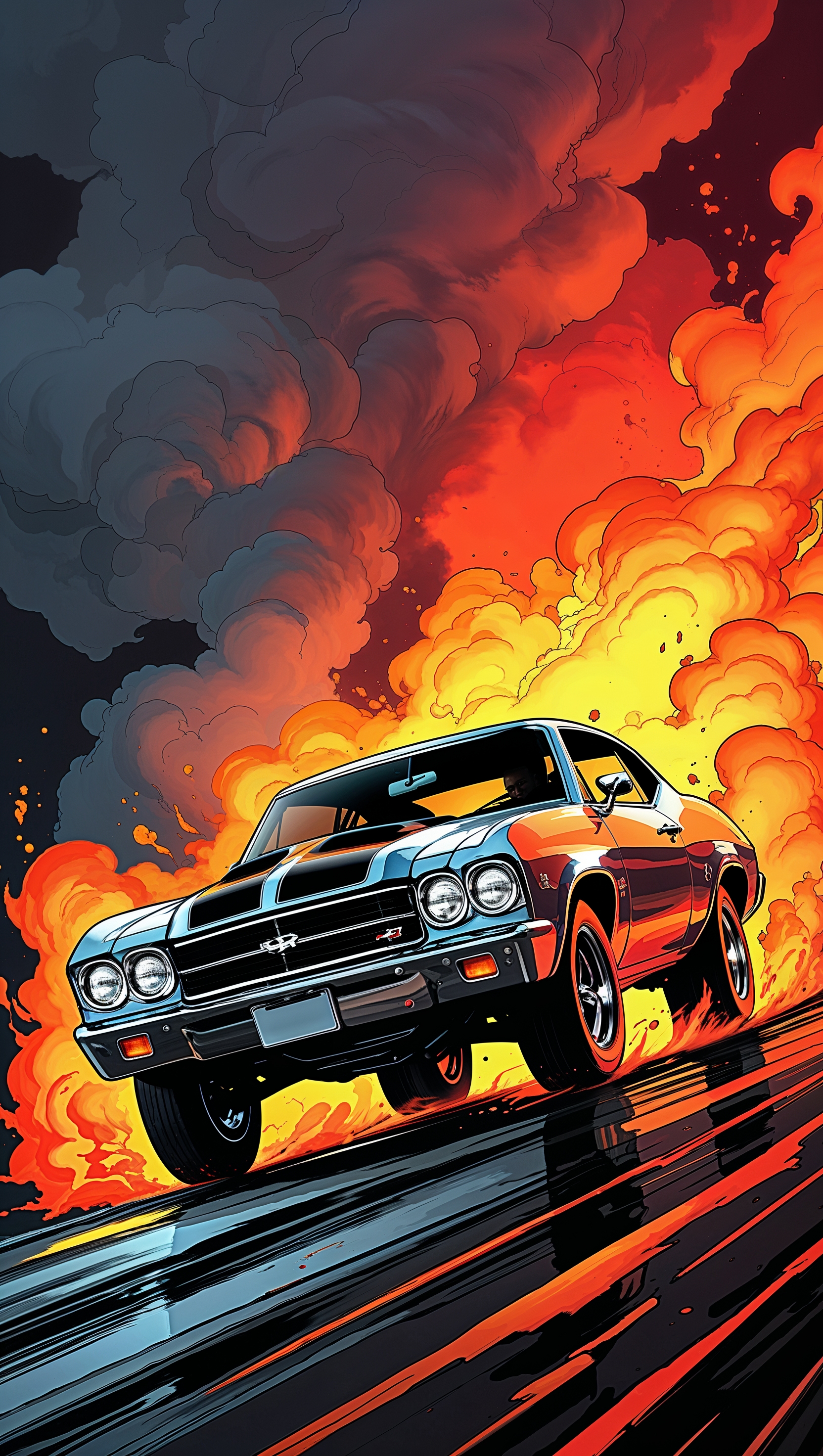 1664x2944 A Chevy muscle car bursting through flames, action-packed style, iPhone wallpaper