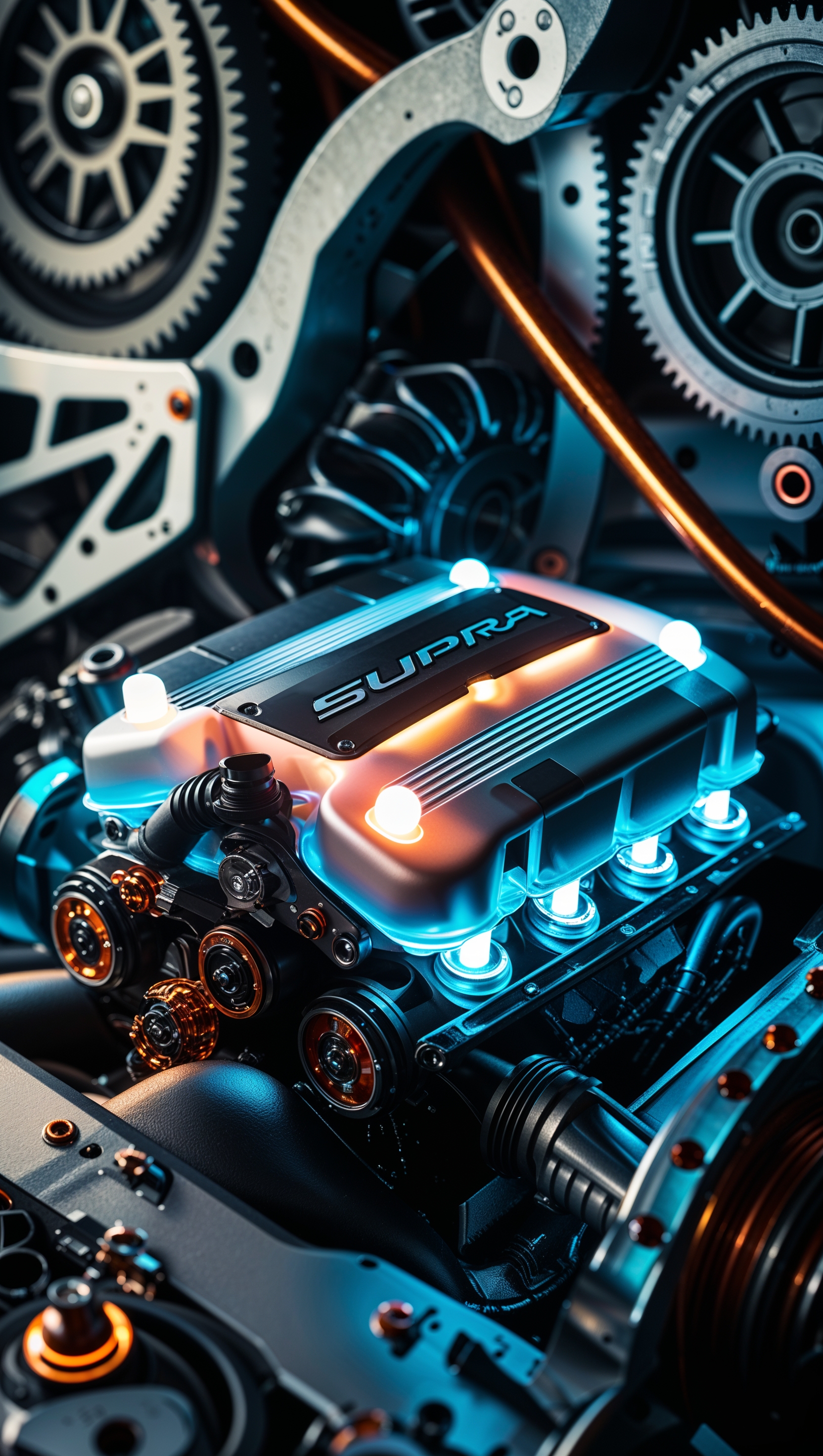 Supra engine close-up with glowing parts, mechanical wallpaper 1664x2944 Supra engine close-up with glowing parts, mechanical wallpaper