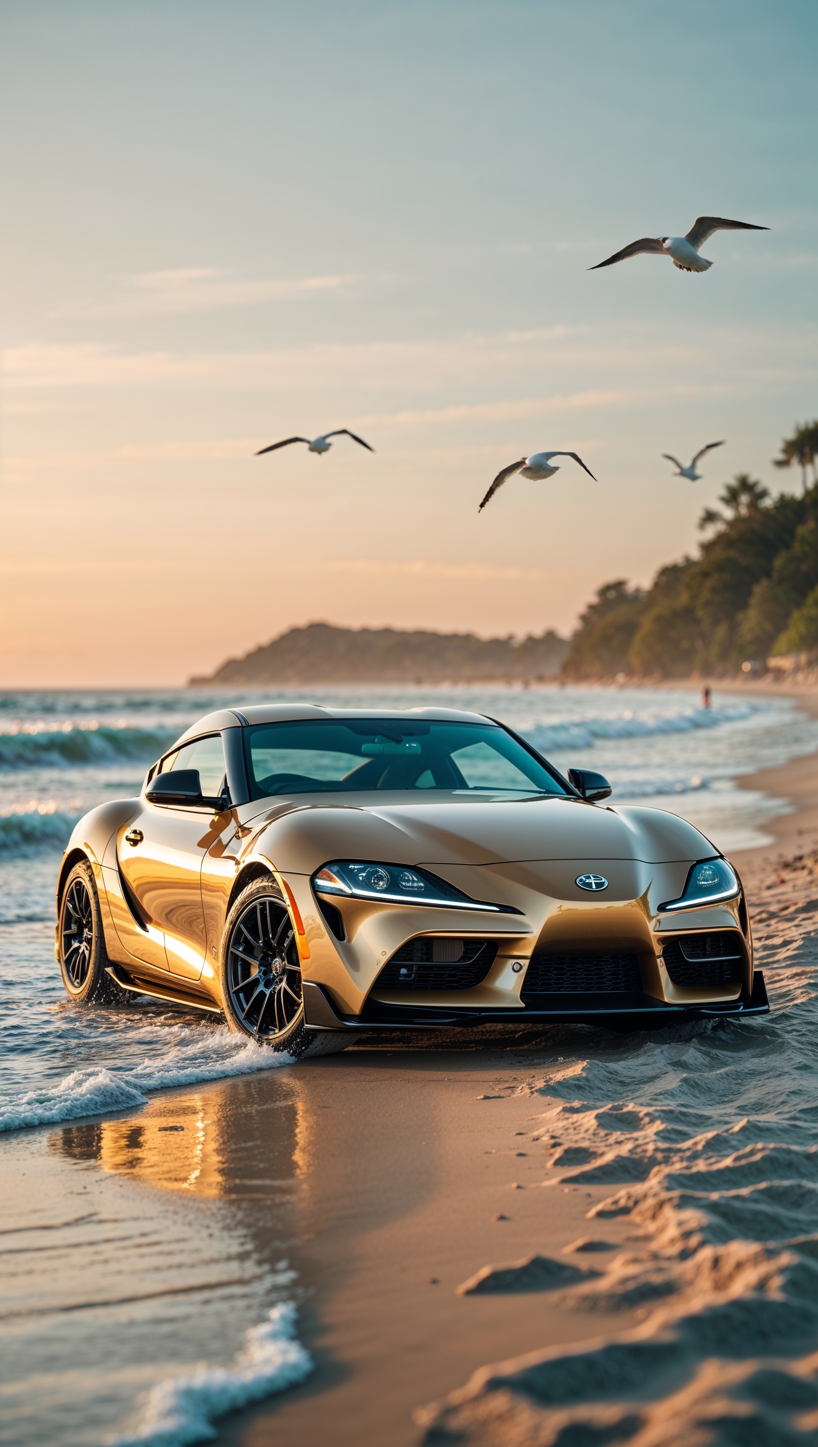 Gold Toyota Supra parked by the beach during golden hour 1664x2944 Gold Toyota Supra parked by the beach during golden hour
