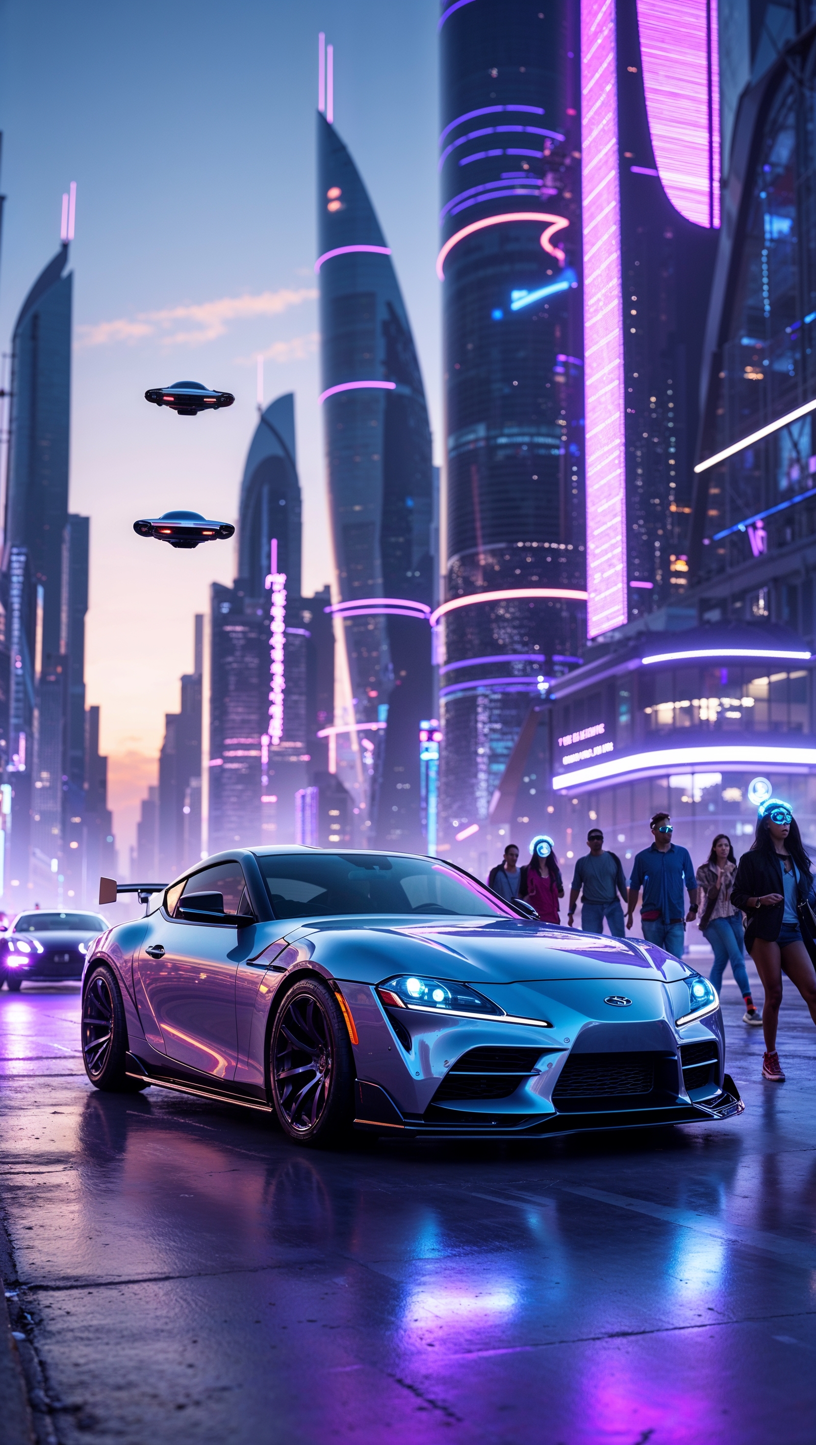 Supra in a futuristic city with flying cars, sci-fi wallpaper 1664x2944 Supra in a futuristic city with flying cars, sci-fi wallpaper