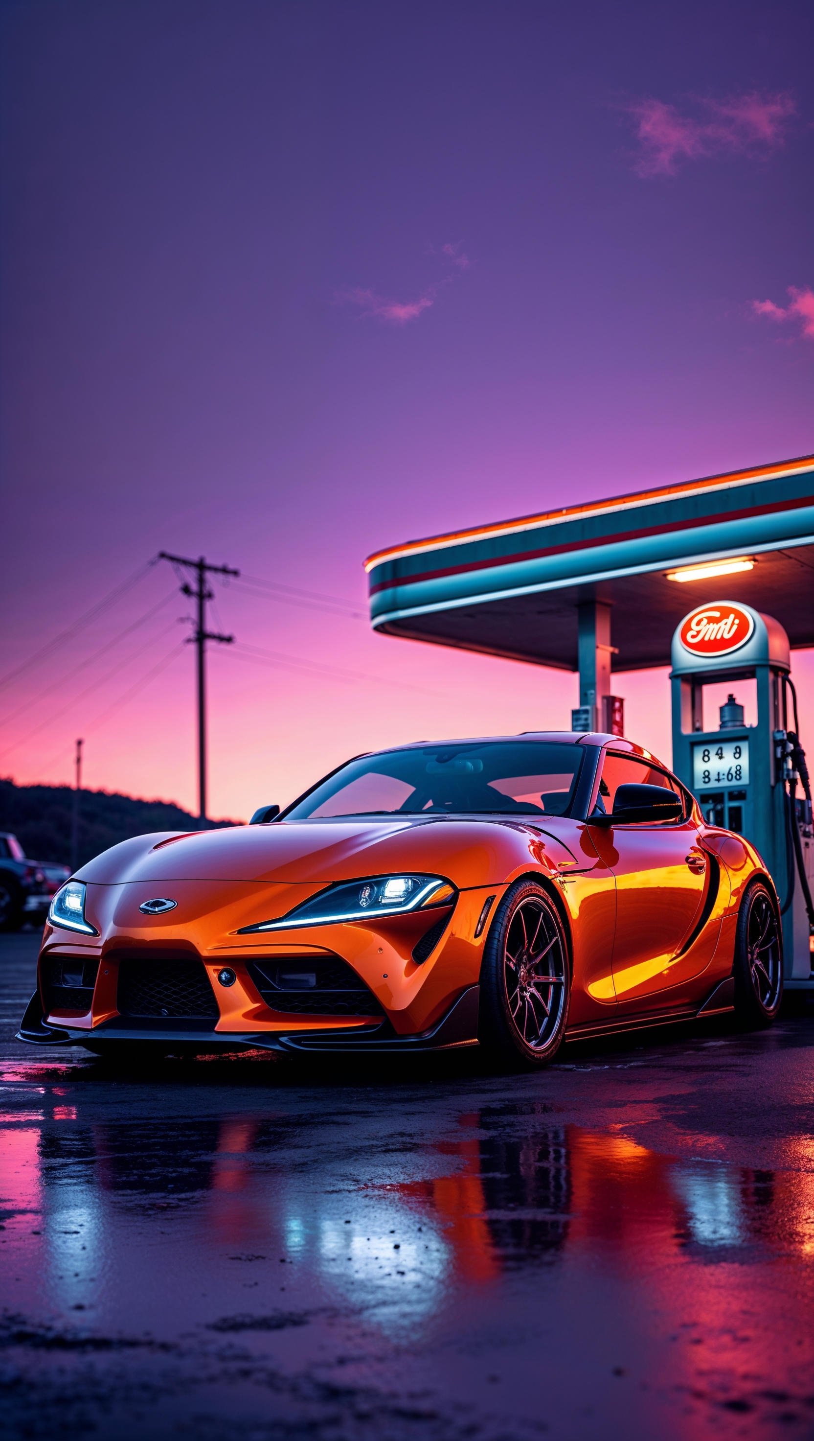Supra at a gas station under purple sky, cinematic frame 1664x2944 Supra at a gas station under purple sky, cinematic frame
