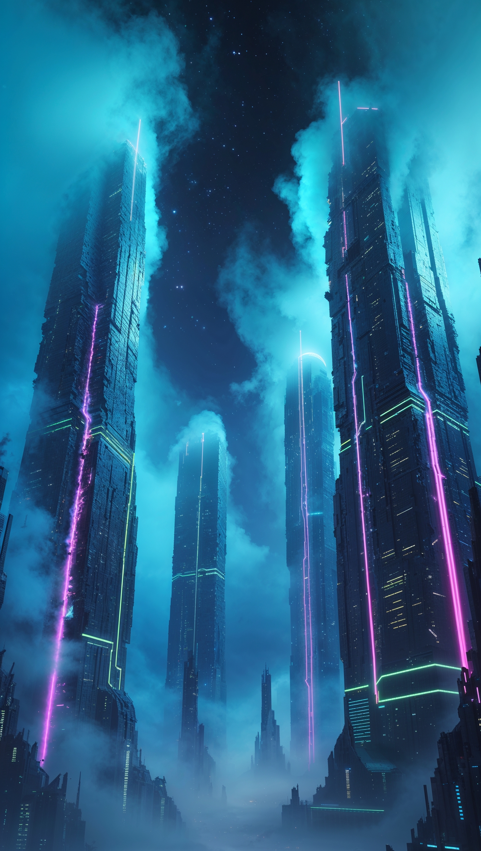 Massive towers in blue mist and neon lights, cyberpunk 40k wallpaper for iPhone 1664x2944 Massive towers in blue mist and neon lights, cyberpunk 40k wallpaper for iPhone