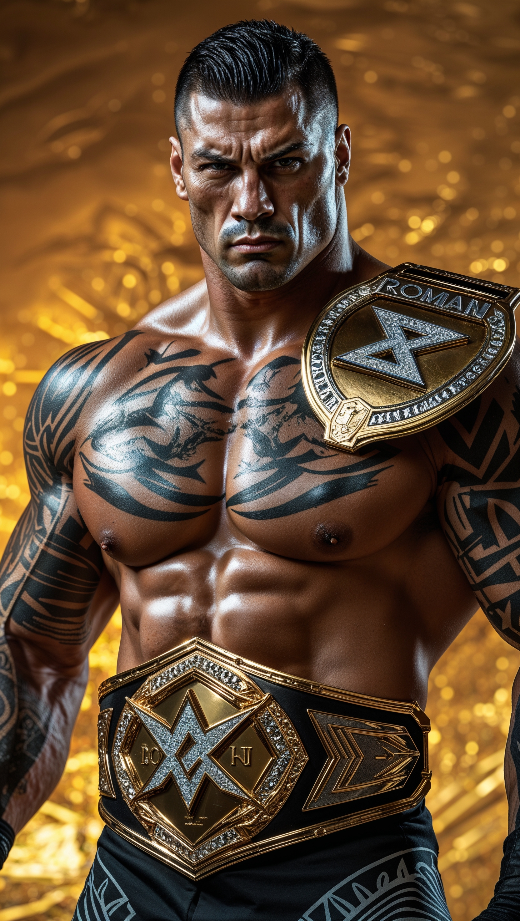 1664x2944 Roman Reigns wearing a championship belt with a golden background