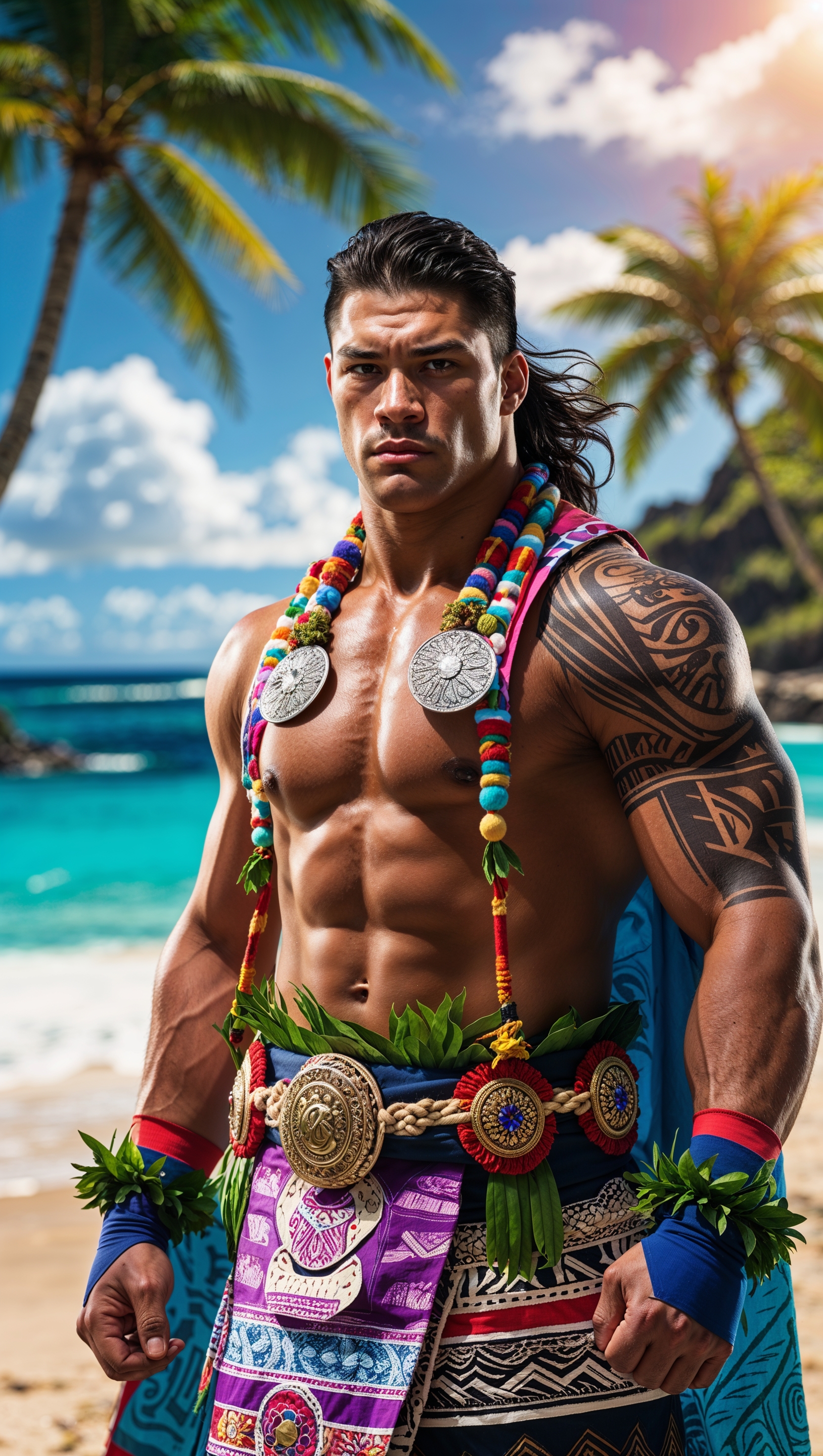 1664x2944 Roman Reigns in traditional Samoan attire with a beach background