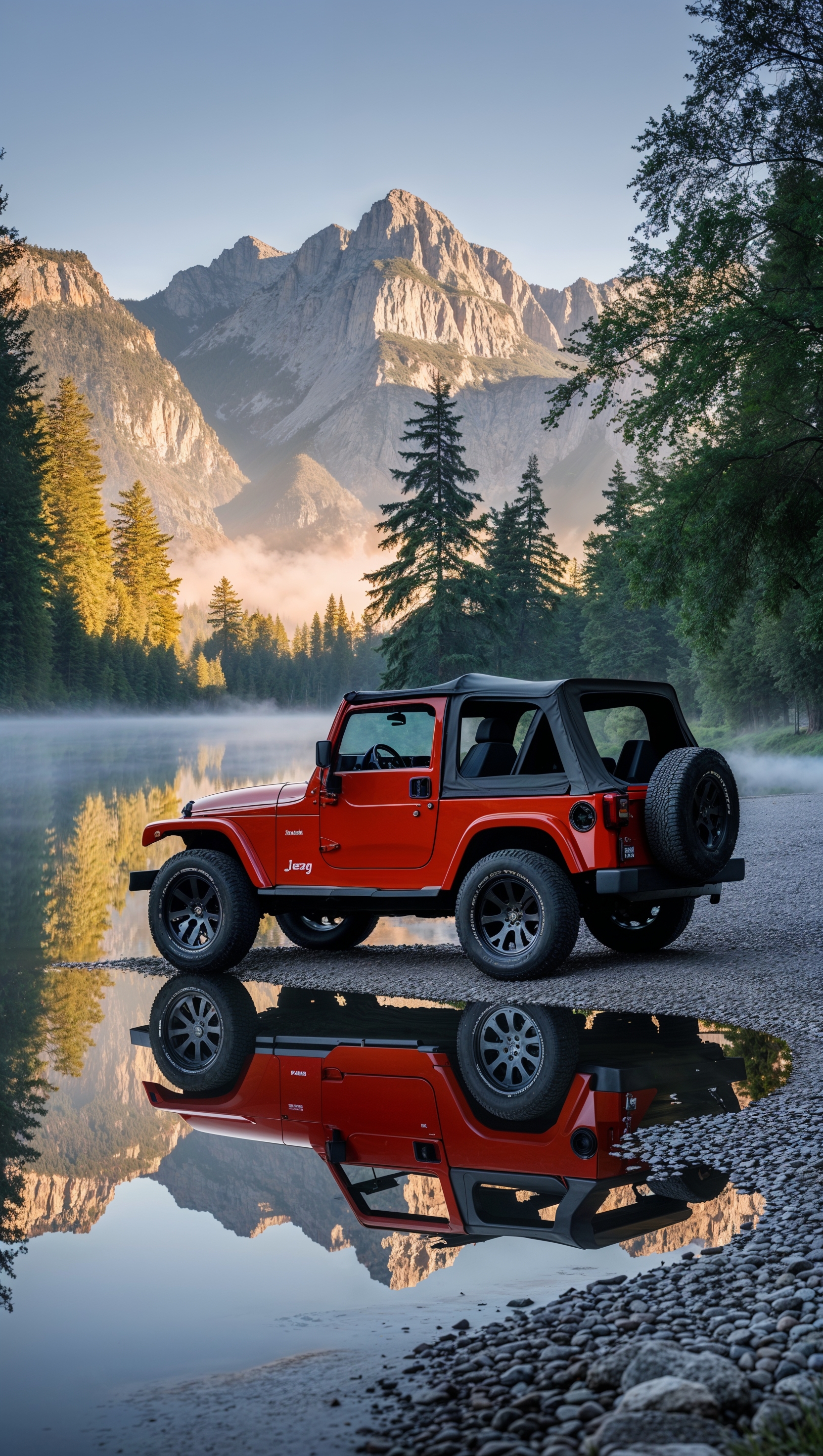 Jeep and mountain reflection in a calm lake 1664x2944 Jeep and mountain reflection in a calm lake