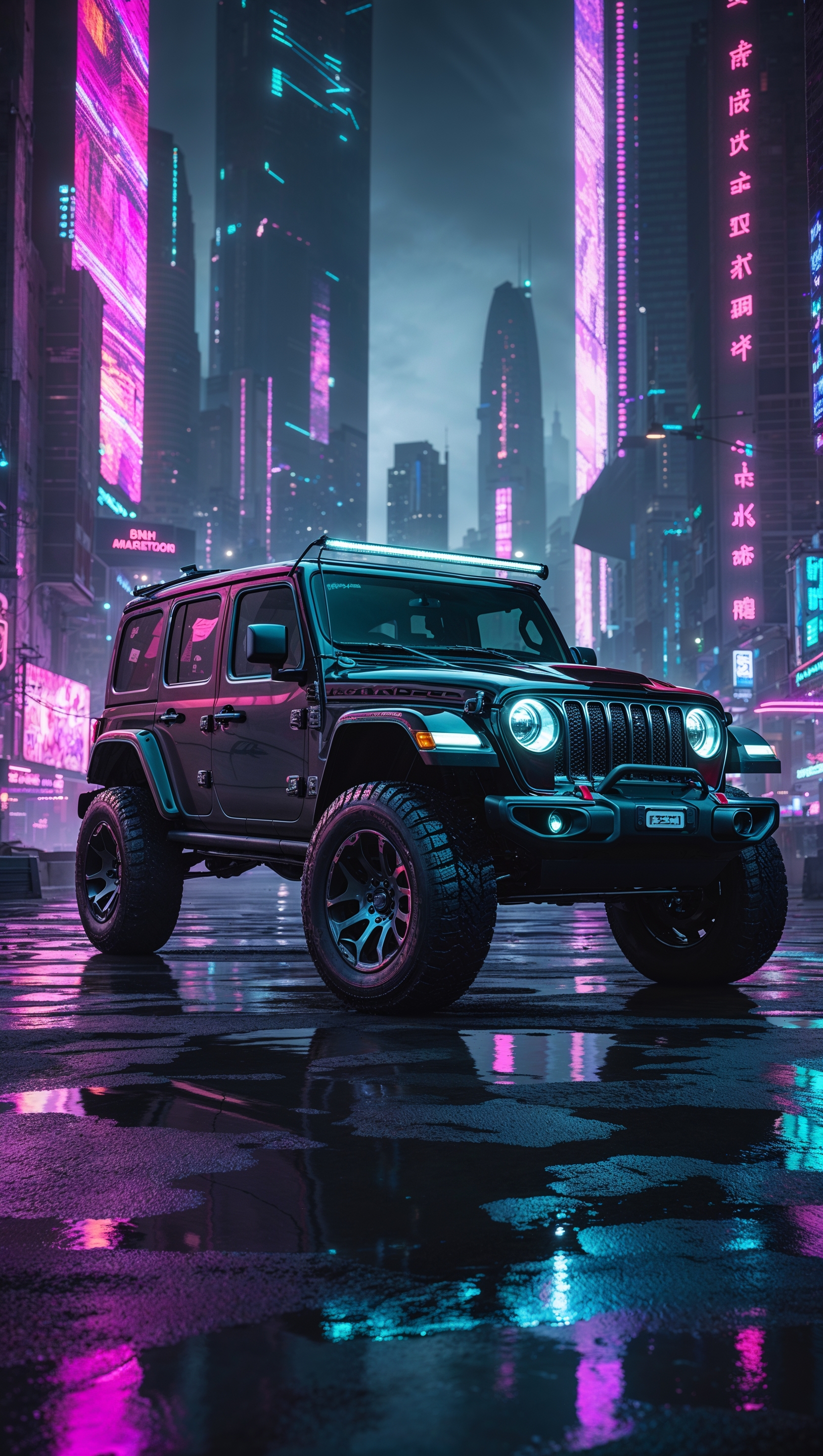 Jeep surrounded by neon lights, cyberpunk city background 1664x2944 Jeep surrounded by neon lights, cyberpunk city background