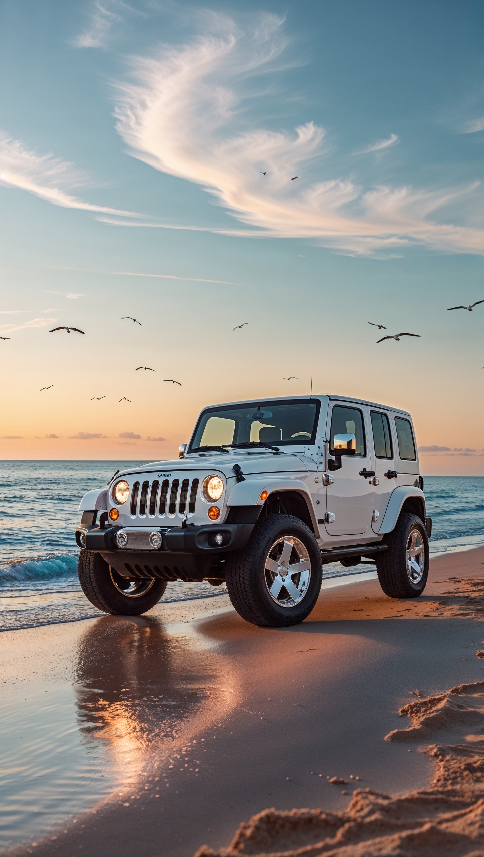 White Jeep on a beach at golden hour, calm ocean waves 1664x2944 White Jeep on a beach at golden hour, calm ocean waves