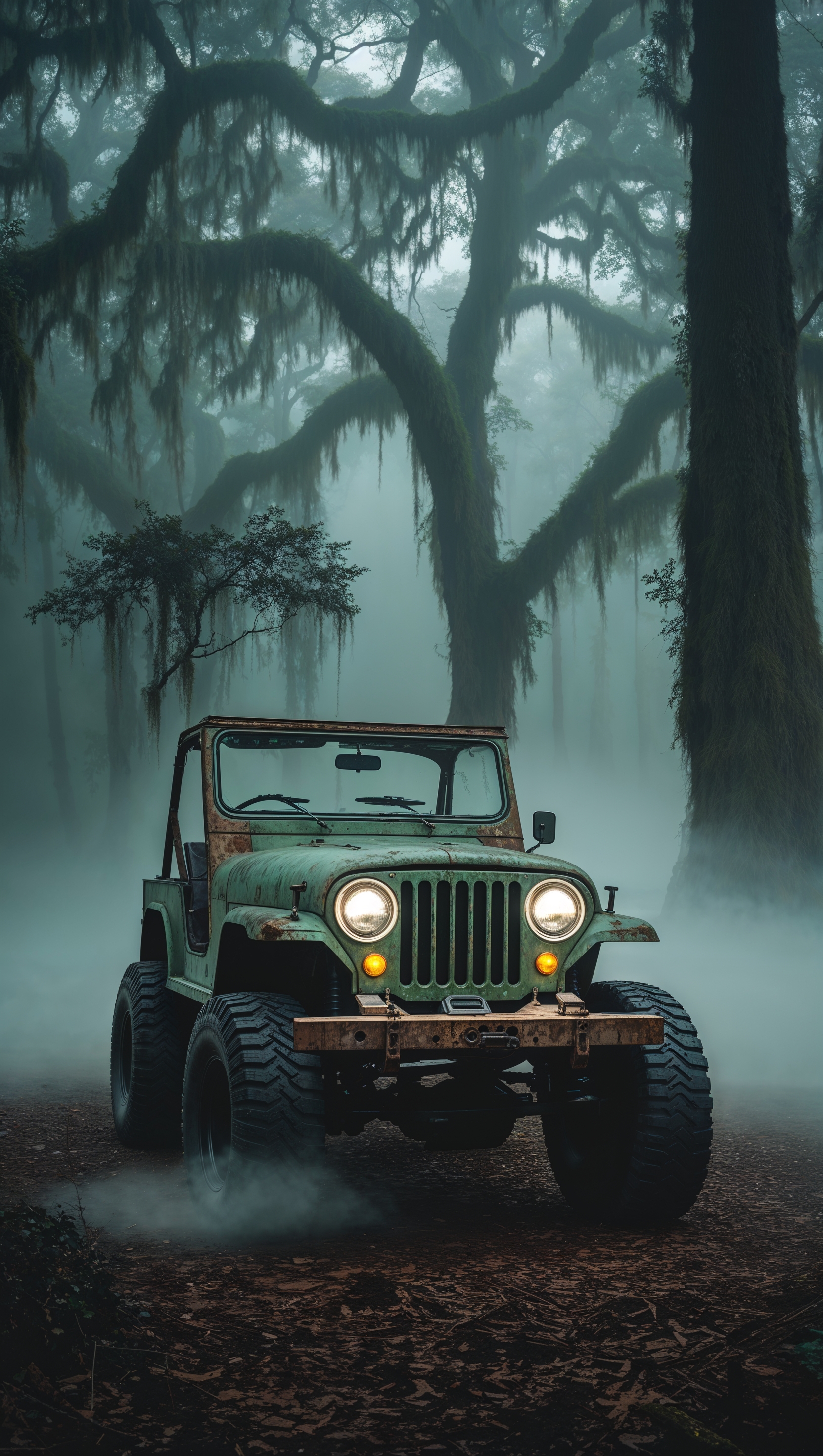 Jeep in a foggy forest, mysterious atmosphere 1664x2944 Jeep in a foggy forest, mysterious atmosphere